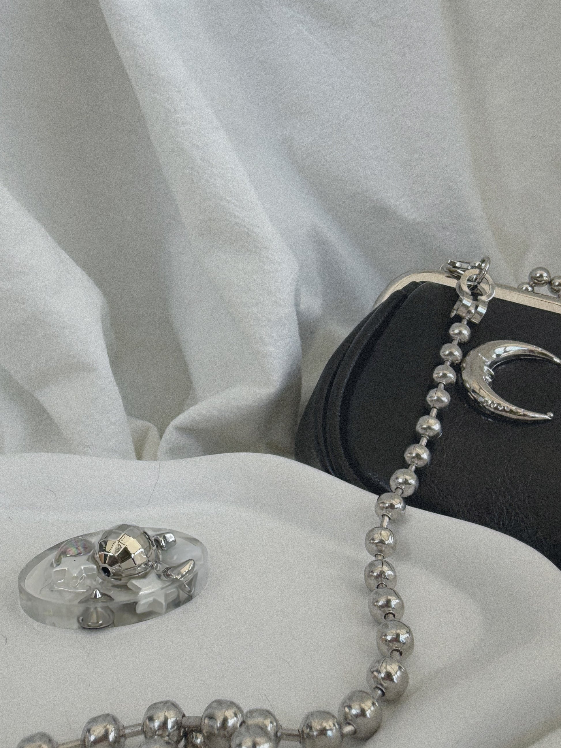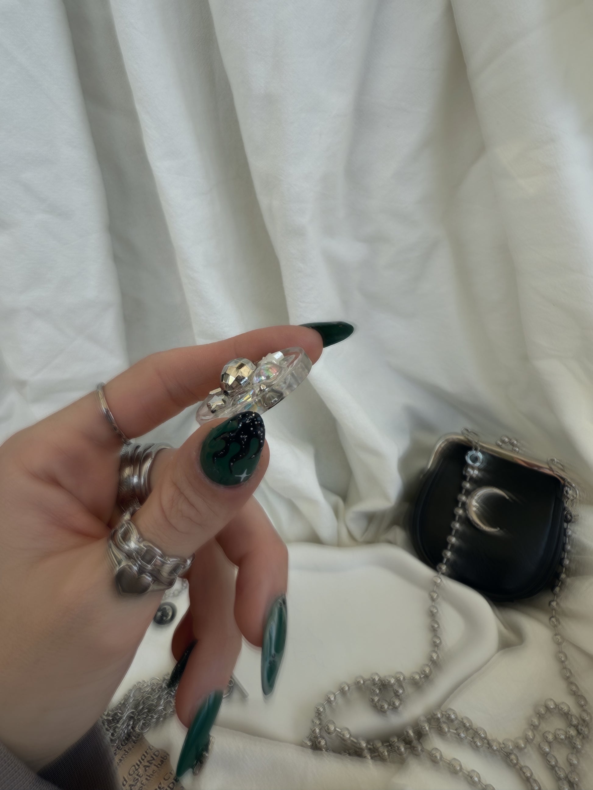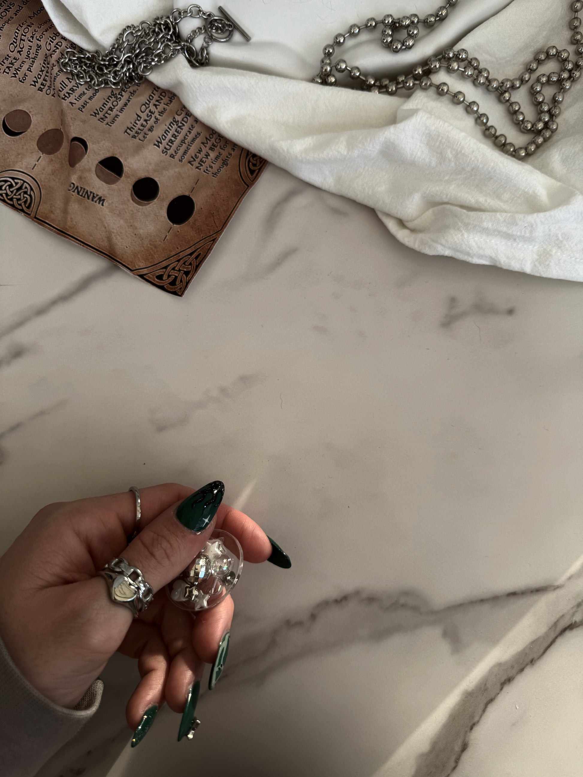 Hello new baby, fresh for November 2025 this tiny oval girl is the perfect addition to your pocket. This gorgeous oval is a transparent base with white and silver treasure on top, the main visual focus of this piece is a tiny silver disco ball.