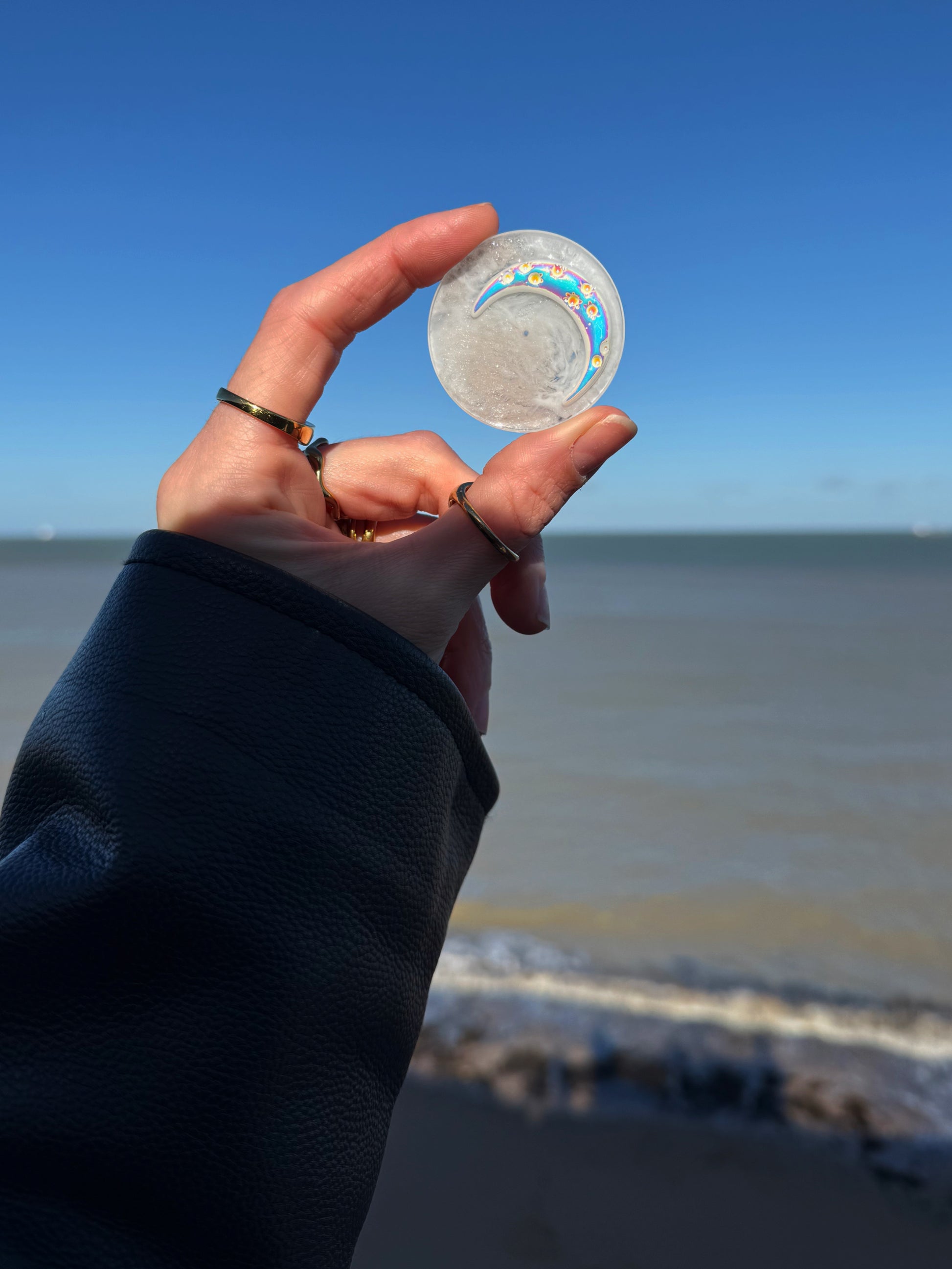 This beautiful micro ripple has a sparkly silver, beige, bone and white marbled base with one perfectly curved crescent moon along the edge, the moon is right at the edge leaving lots of negative space for smooth feelings under your thumb.