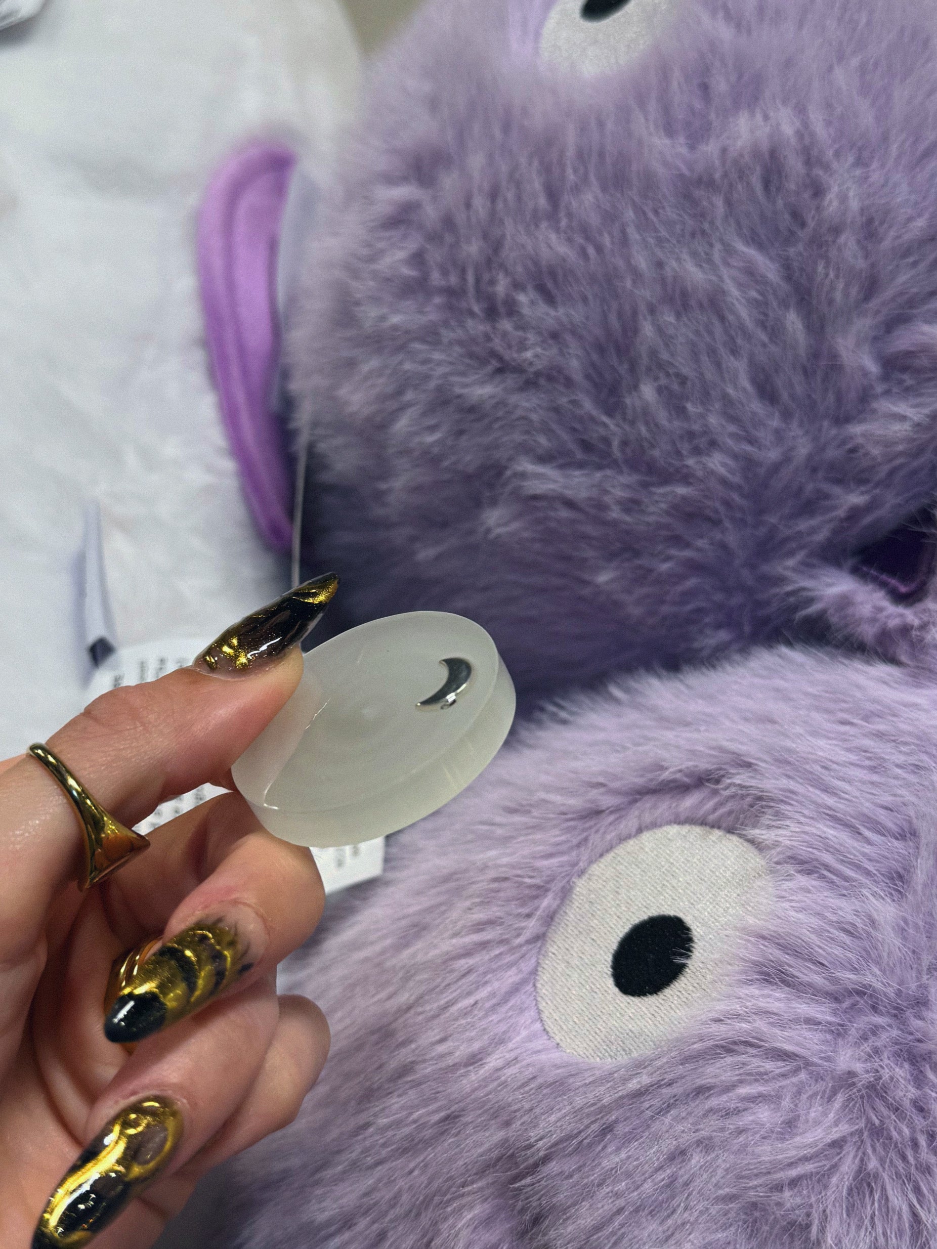 This might be is chalk full of glow-in-the-dark powder, on talk she has a perfectly clear very thin layer of resin with one silver crescent moon to the side, the moon provides a small bump of cold texture and the rest of this piece is perfectly smooth. You can make your microphone glow by popping her on the windowsill taking her outside for natural sunlight or using a UV lamp when she charges in seconds.