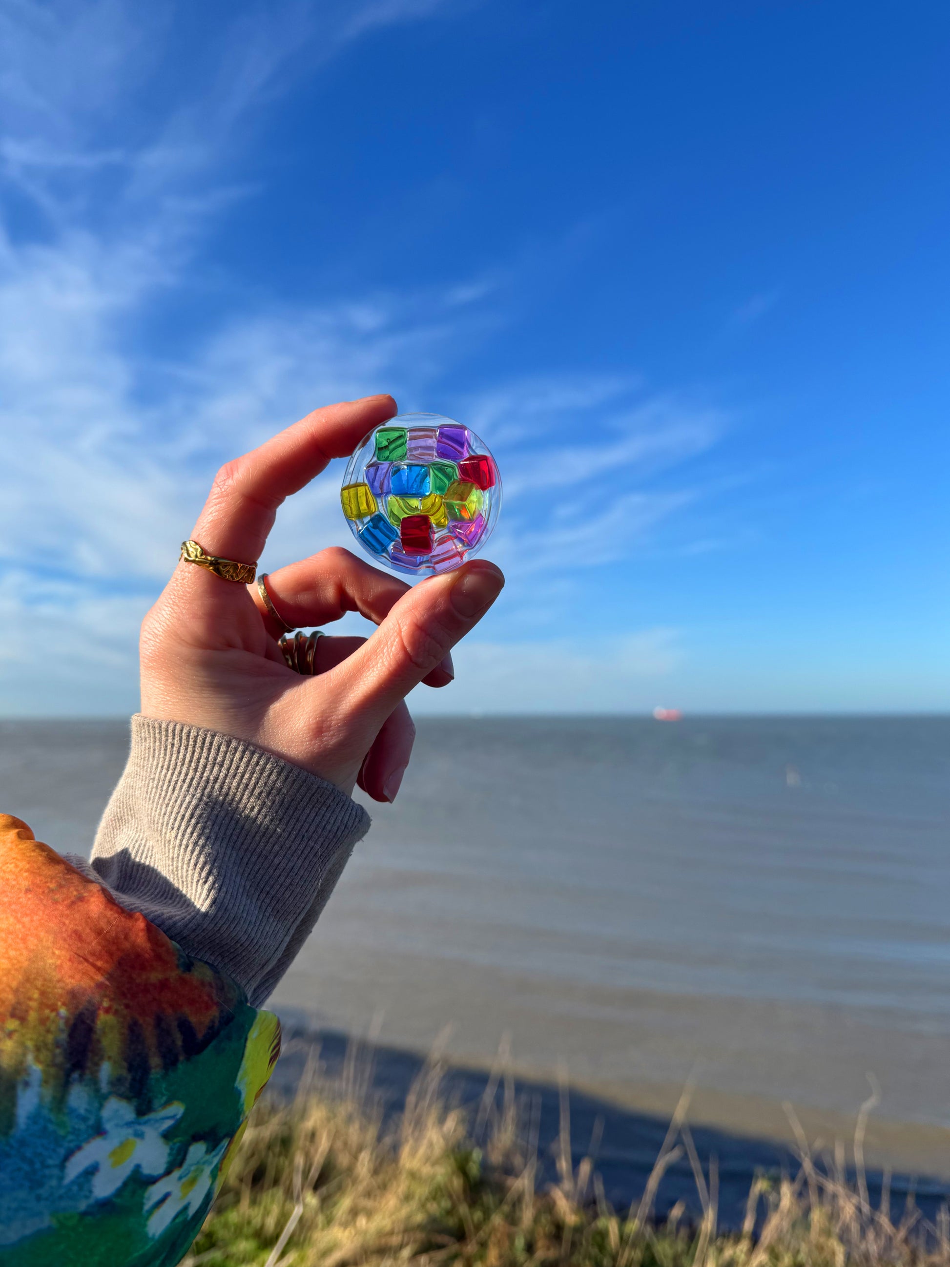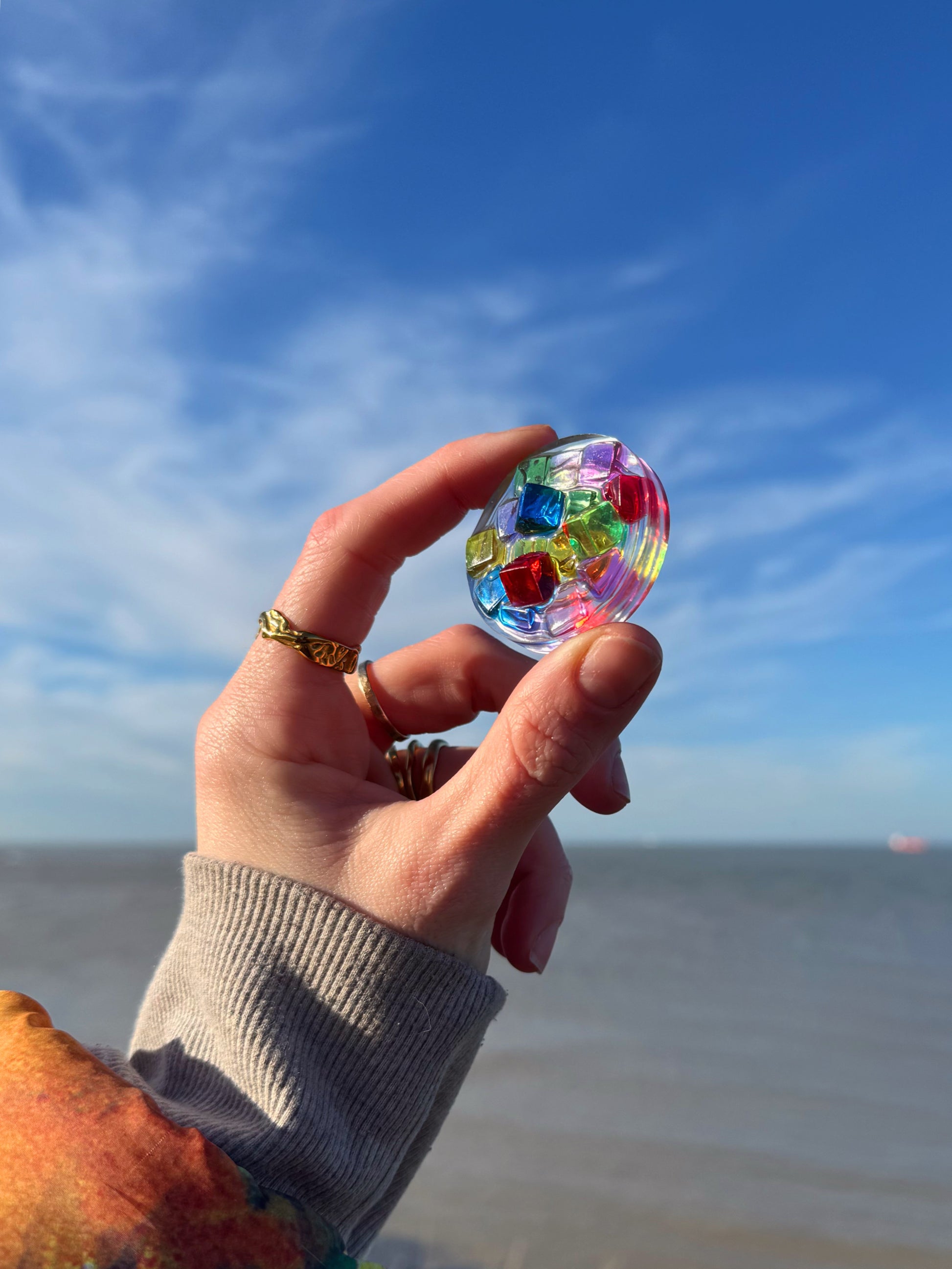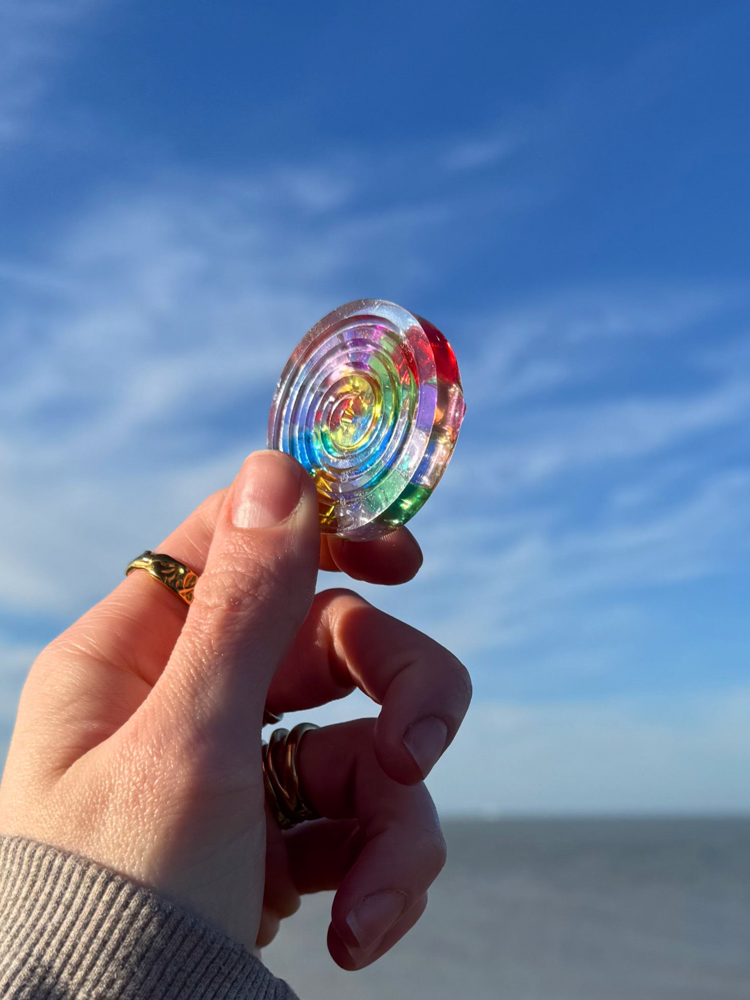 This limited edition micro ripple is a clear base full of transparent coloured blocks. This base of our micro ripple has a perfect spiral carved into the hard resin to trace your finger tip around. The perfect mixture of small, subtle, smooth and textured micro ripple measure only 2 inches across.