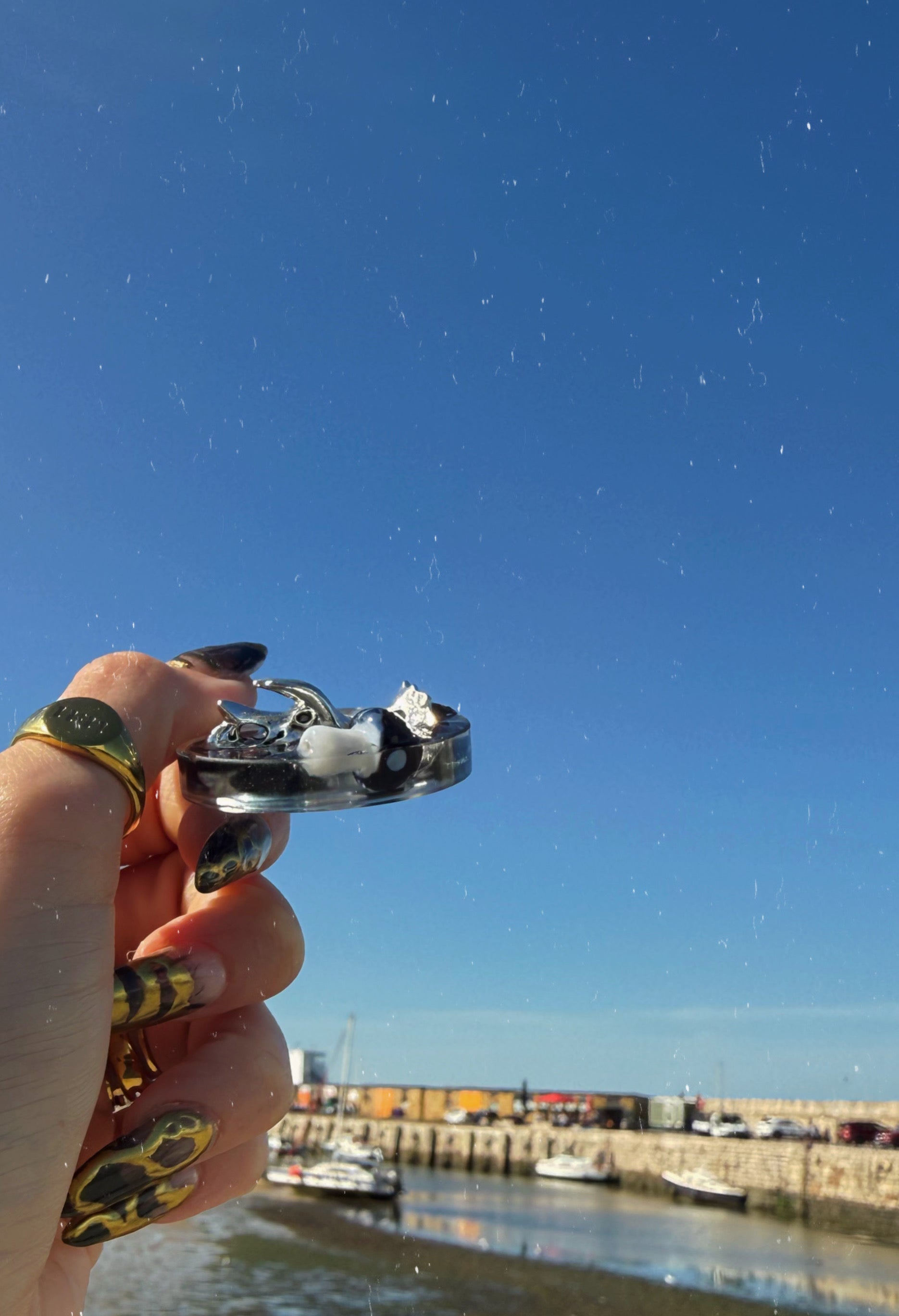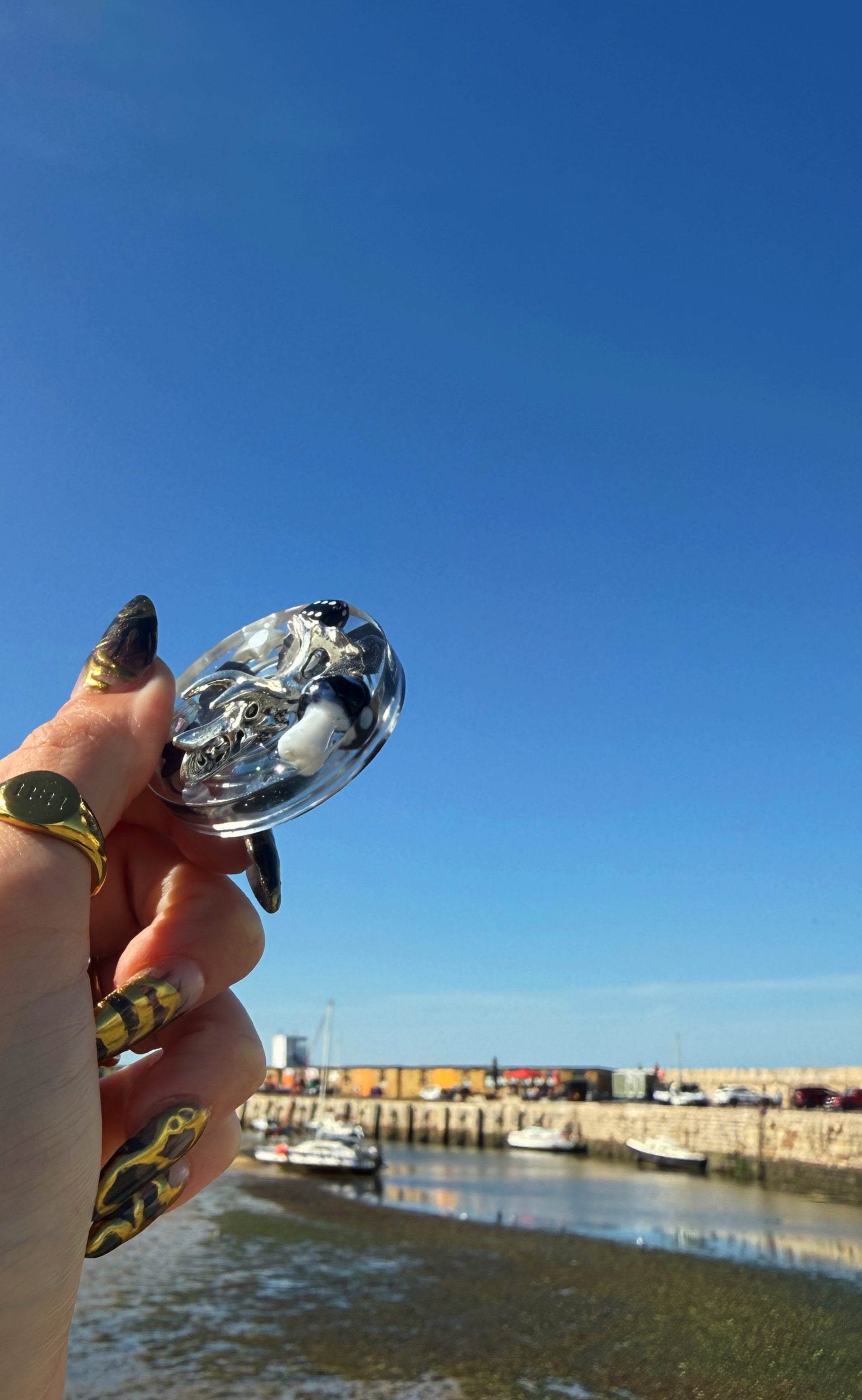 This micro ripple has a perfectly clear base, sat on top with a mix of white black and silver treasure sat in the centre is a large heavy metal triceratops skull, the skull has two large horns at the top perfect for running over your skin gently, the school is so big that this micro ripple is 10 grams heavier than our regular ones that’s 50%.