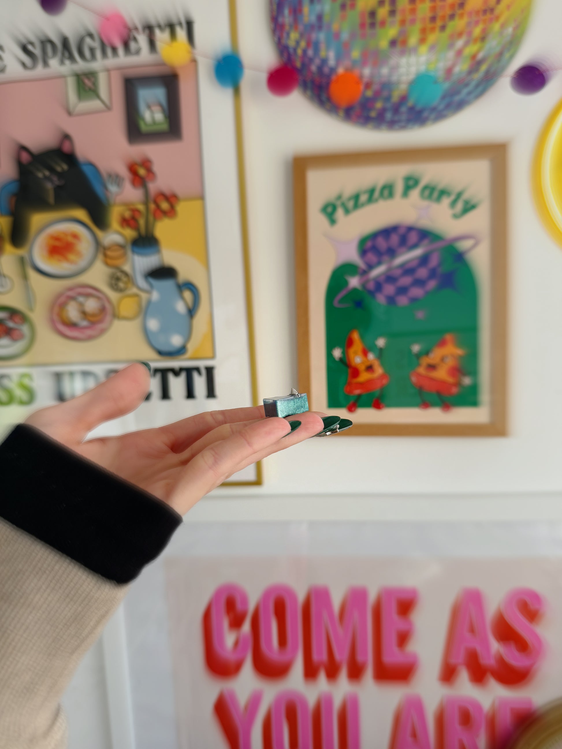 This wave is a shiny blue base with one jazshouse safe spike on the back, our safe spikes are small metal rounded spikes that are designed to dent not break skin.
