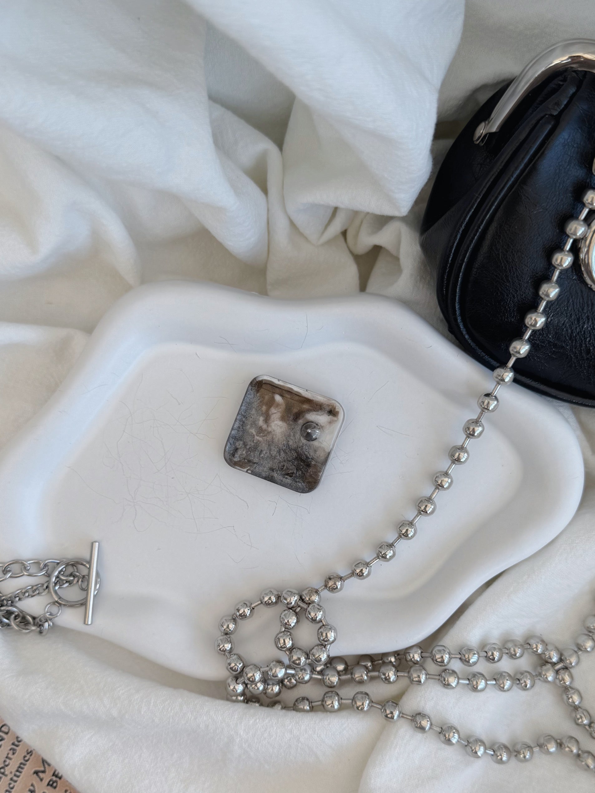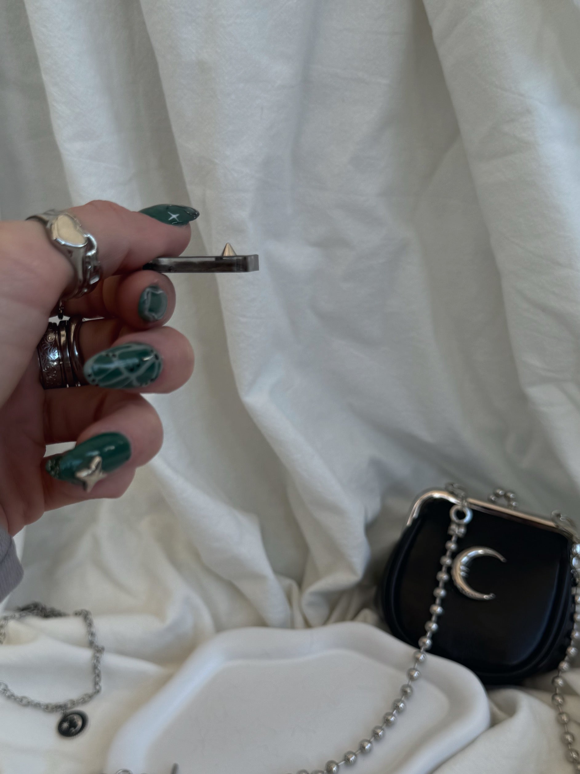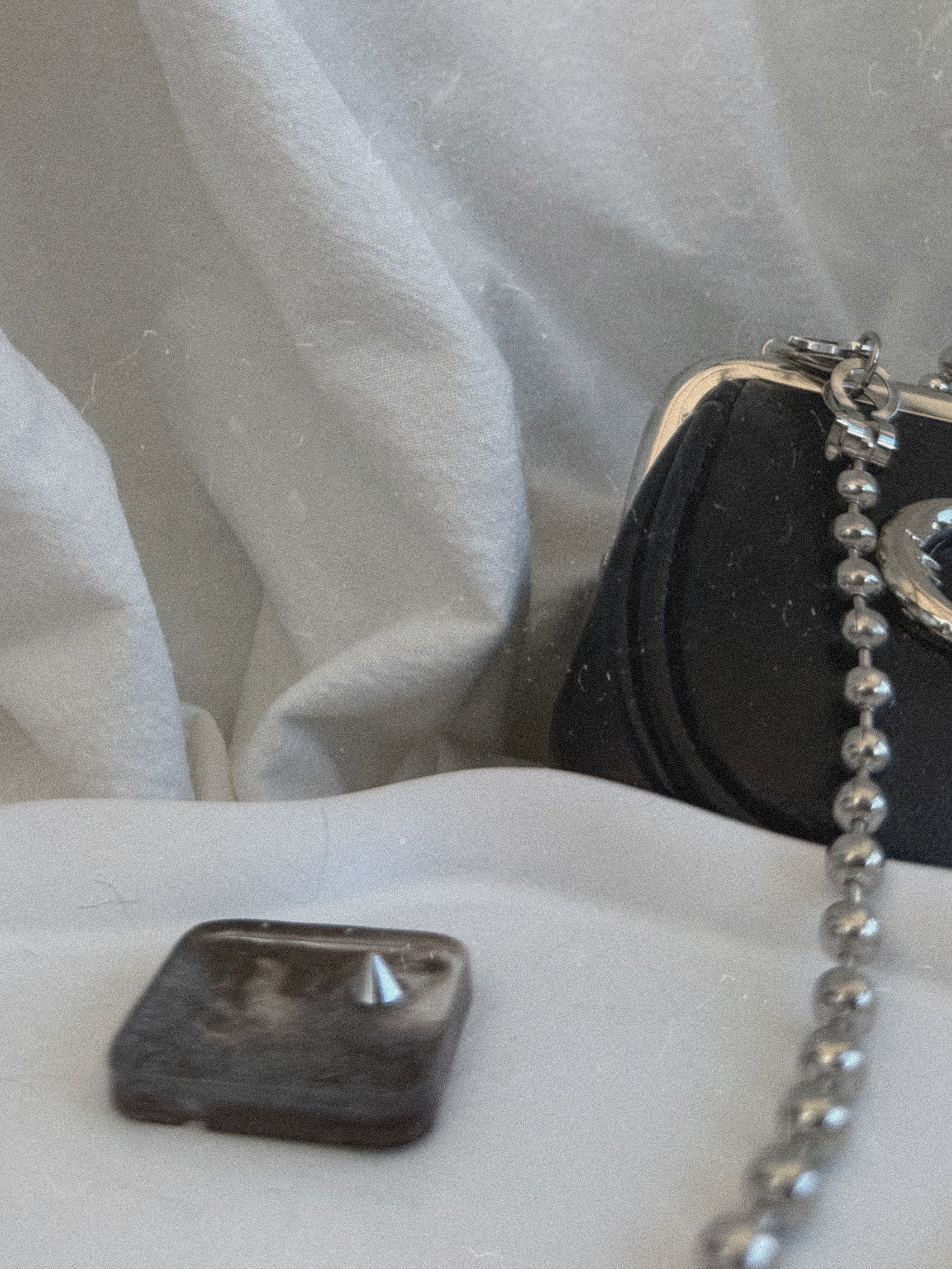 Hello new baby, fresh for November 2025 our mini square is a tiny pocket piece, it’s transparent and shiny brown neutral themed base, on top of the base there is a one of our jazshouse safe spikes, this is a small metal rounded spike designed to dent not break skin.