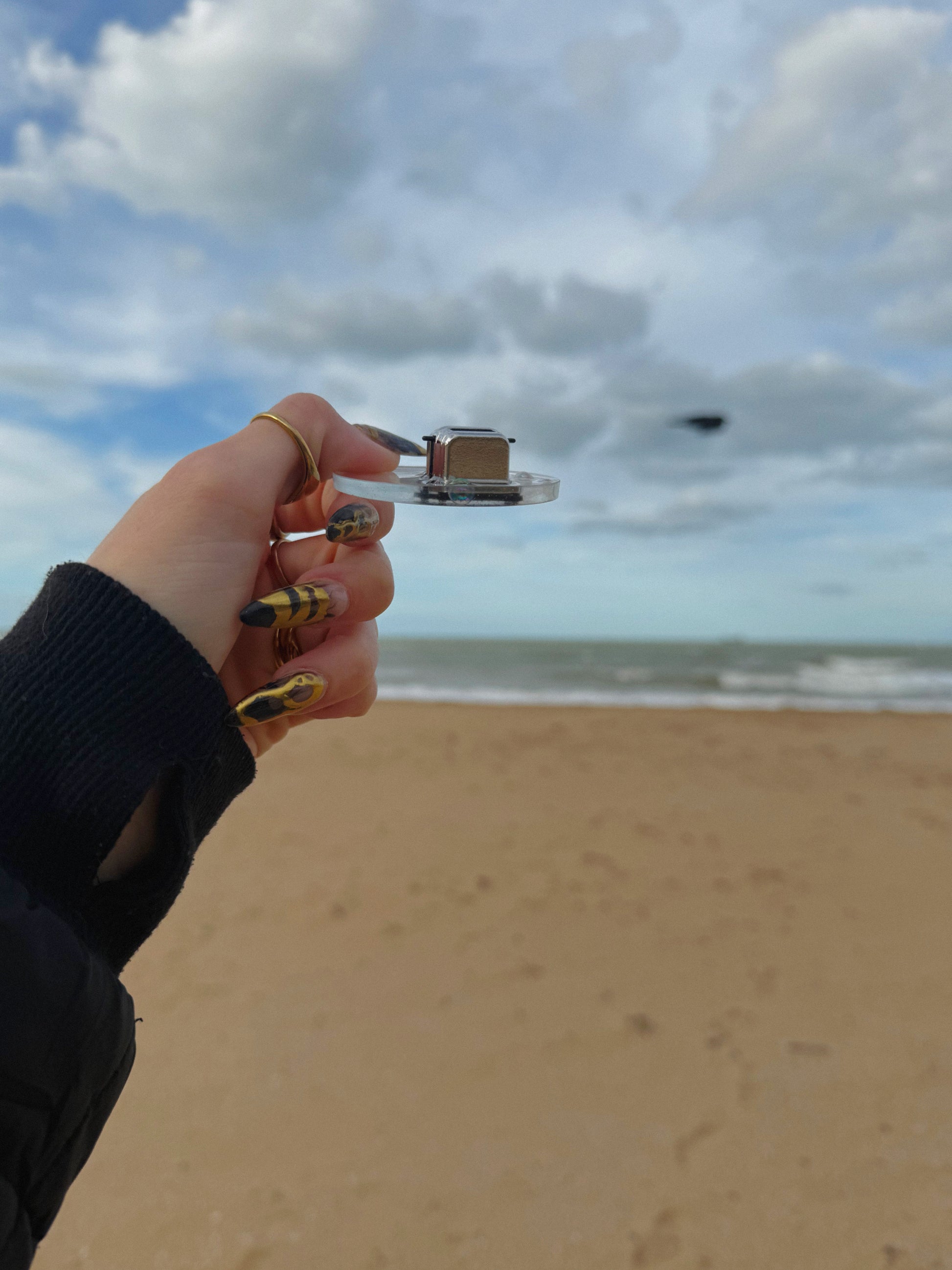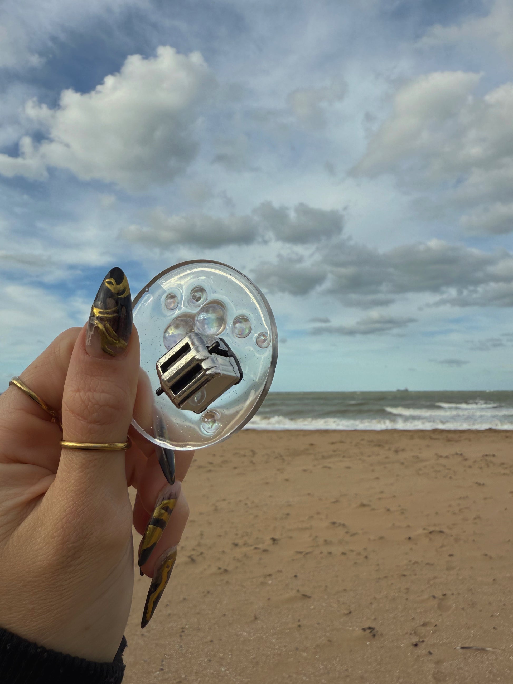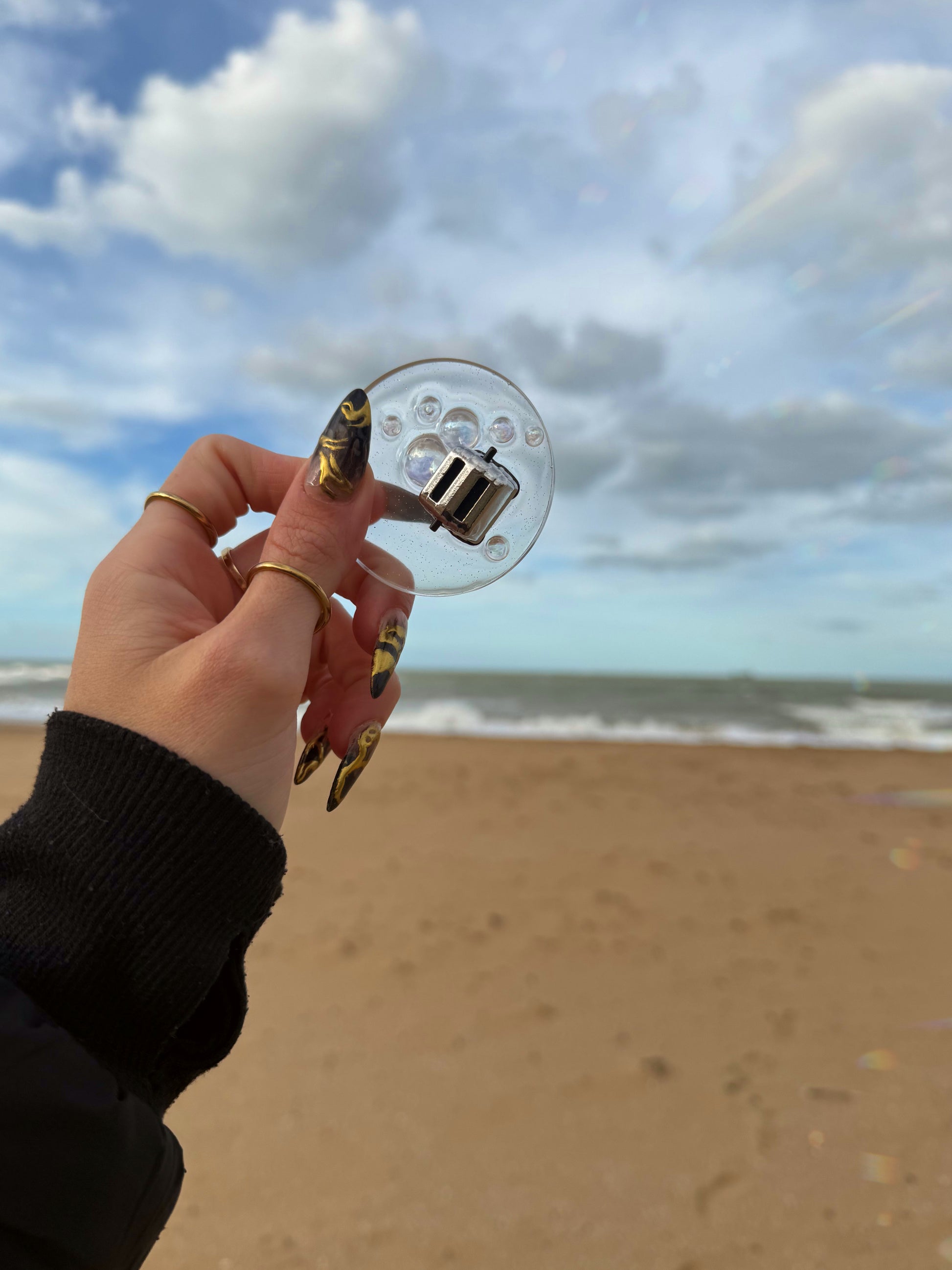 This limited edition mini tink is a crystal clear base, with a subtle sparkle. On top is a miniature toaster with iridescent acrylic bubbles. Our gorgeous mini toasters work with a spring loaded bottom you can use your fingers to hold down the levers each side pop in your two pieces of clay toast that come with your tinker and when you release the levers it flings outwards. There was only one section of texture on this mini tinker. The rest is perfectly smooth.