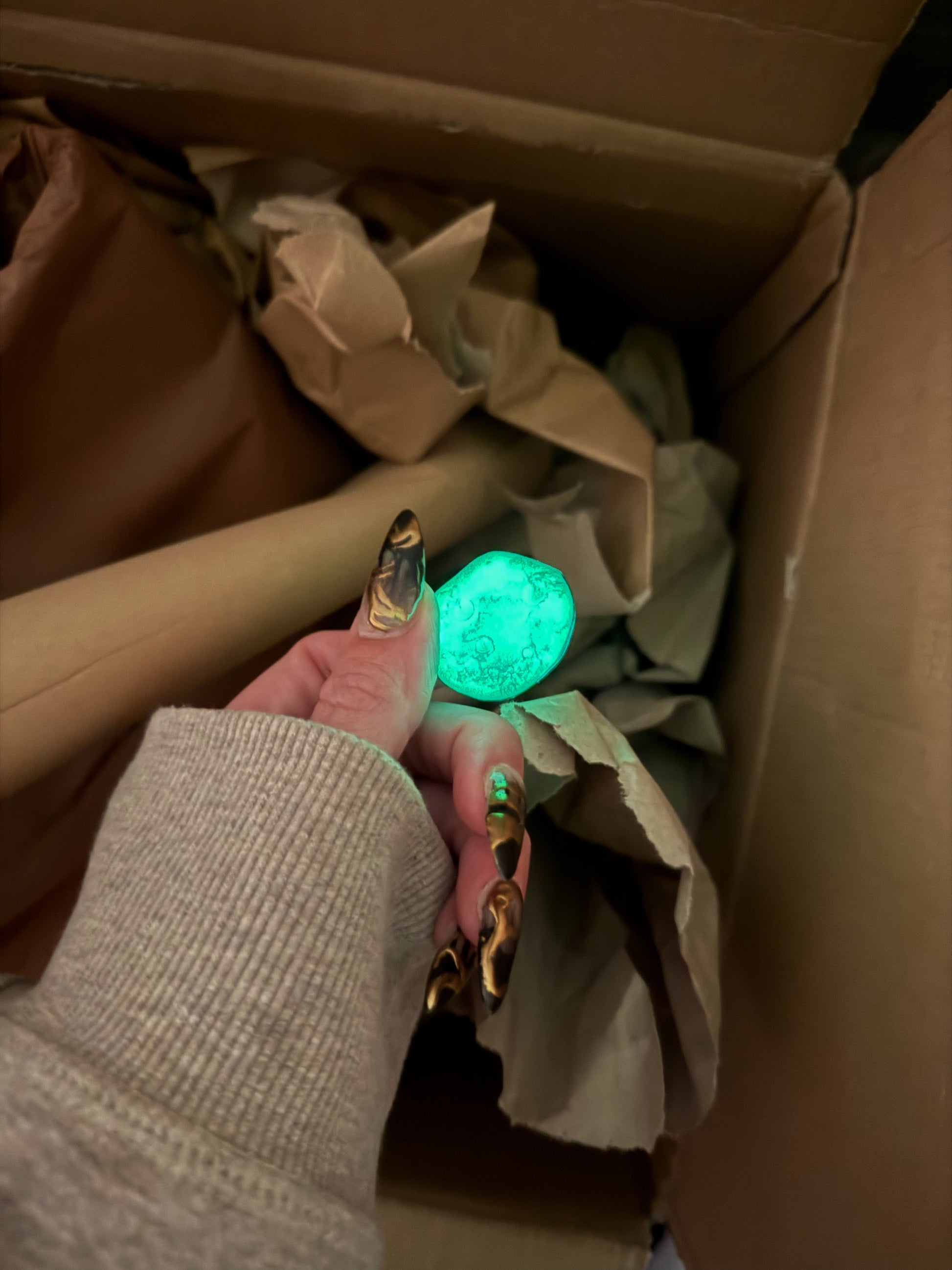 This Moonrock is filled with glow-in-the-dark powder set inside black ink. This gives it almost a model look in your hands and a shadow when it’s glowing. Our moon rocks have divots and lines on the top perfect texture under your thumb and a perfectly smooth base.