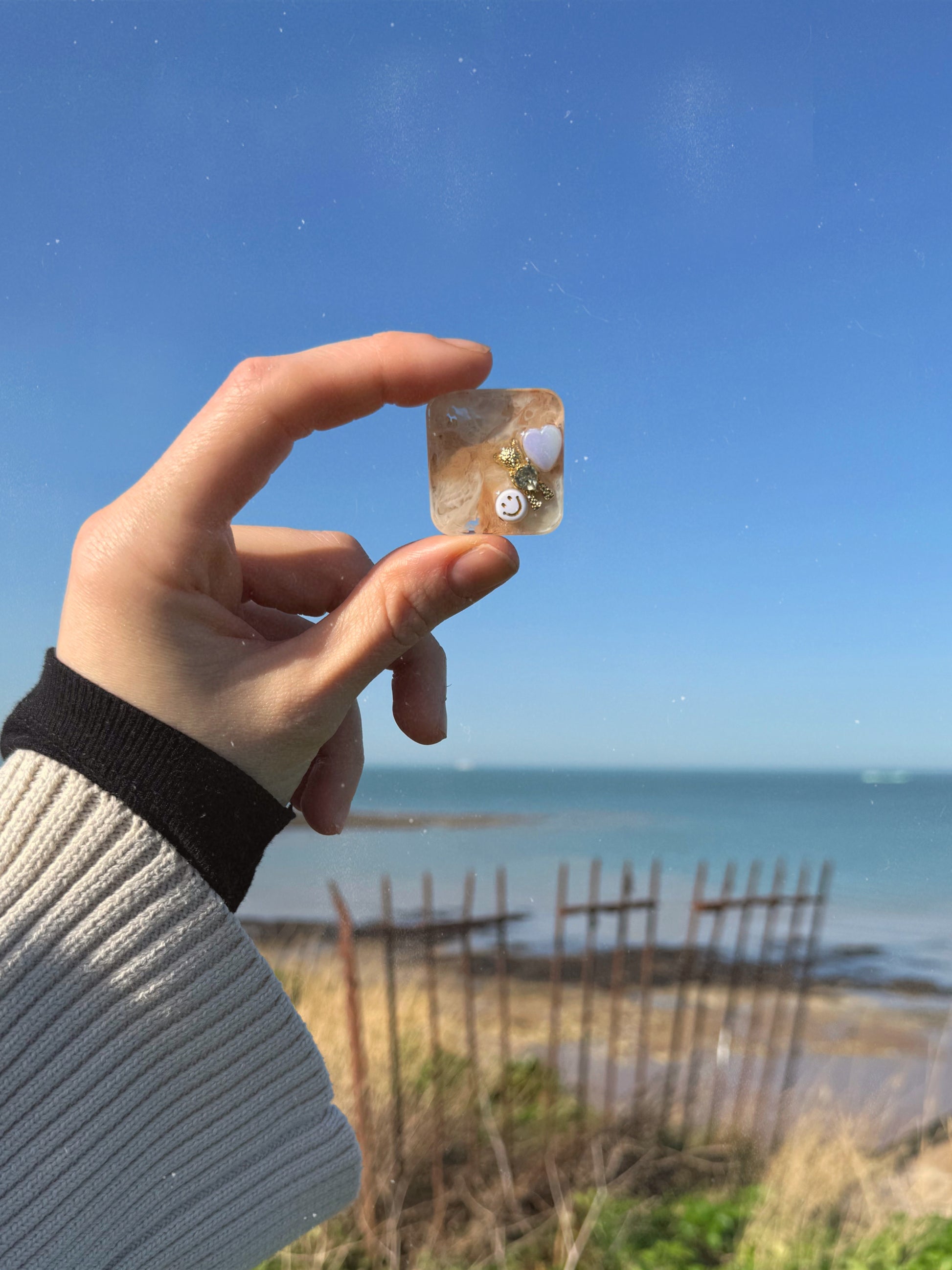 Based on the colour theme of a clean girl  baddie with her nails done this min square is a mix of beiges as a solid colour base with gold and white charms on one side on top, the charms are a mix of metal and plastic, they are together in one corner to give you the perfect tracing pattern to get textured under your thumb.