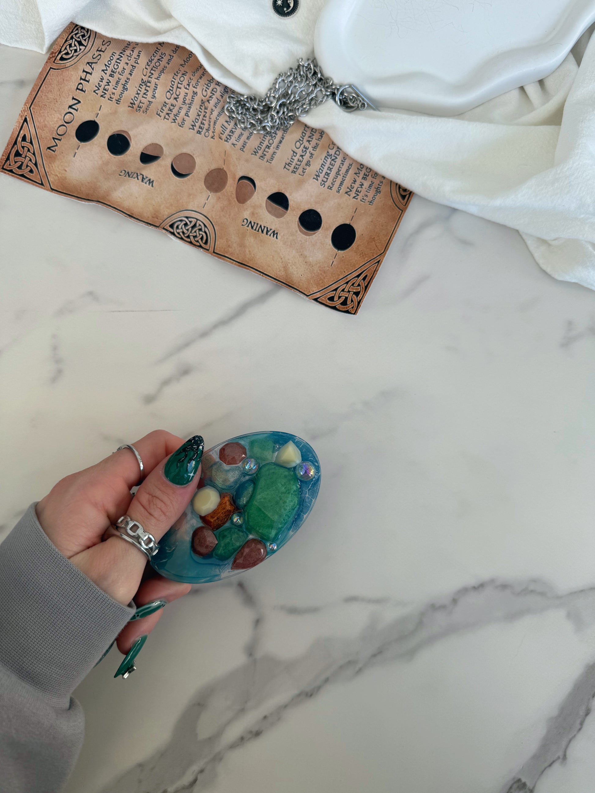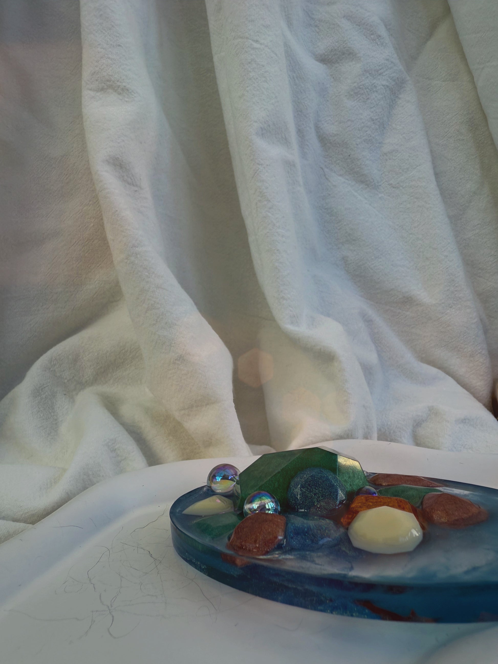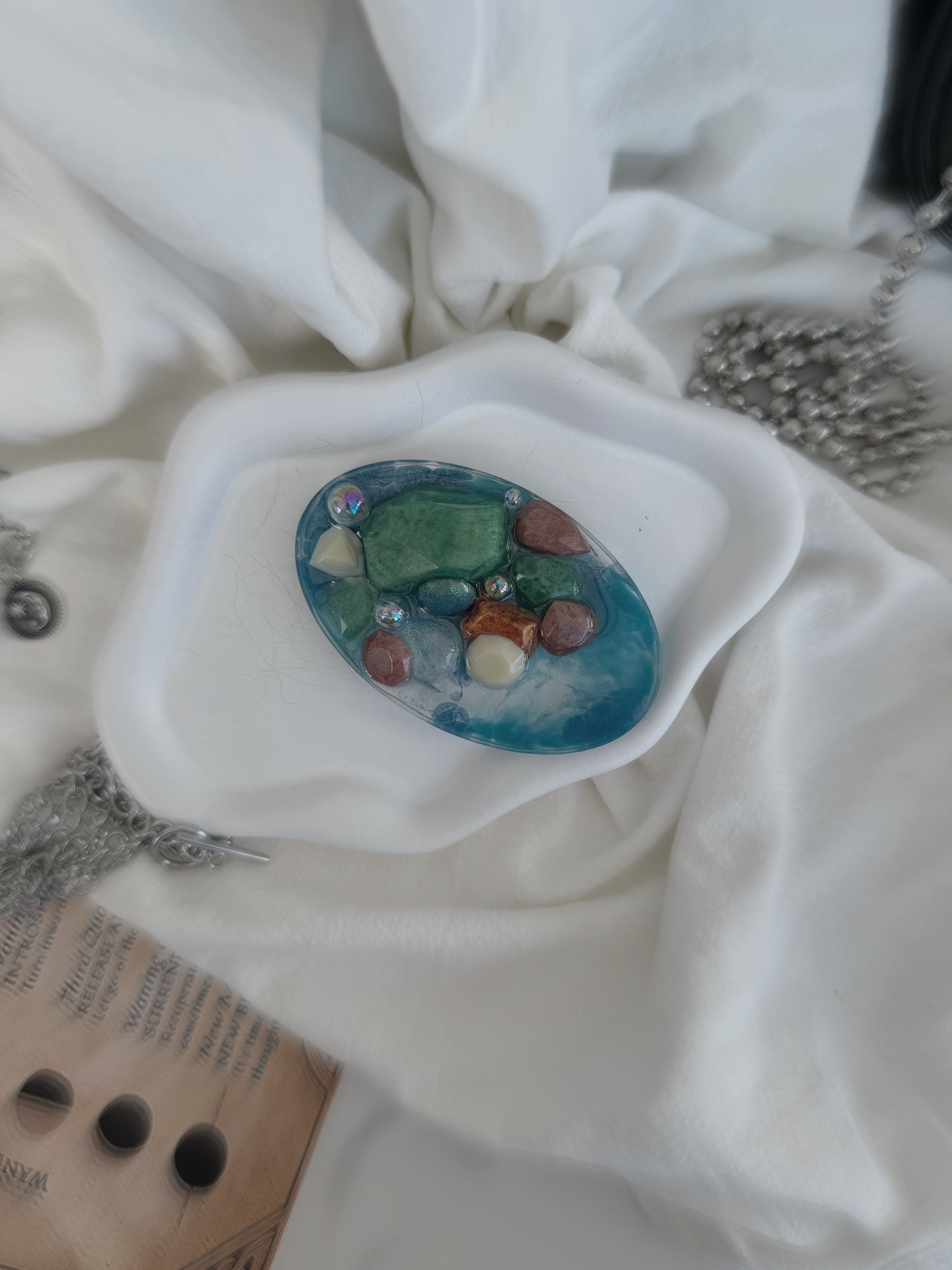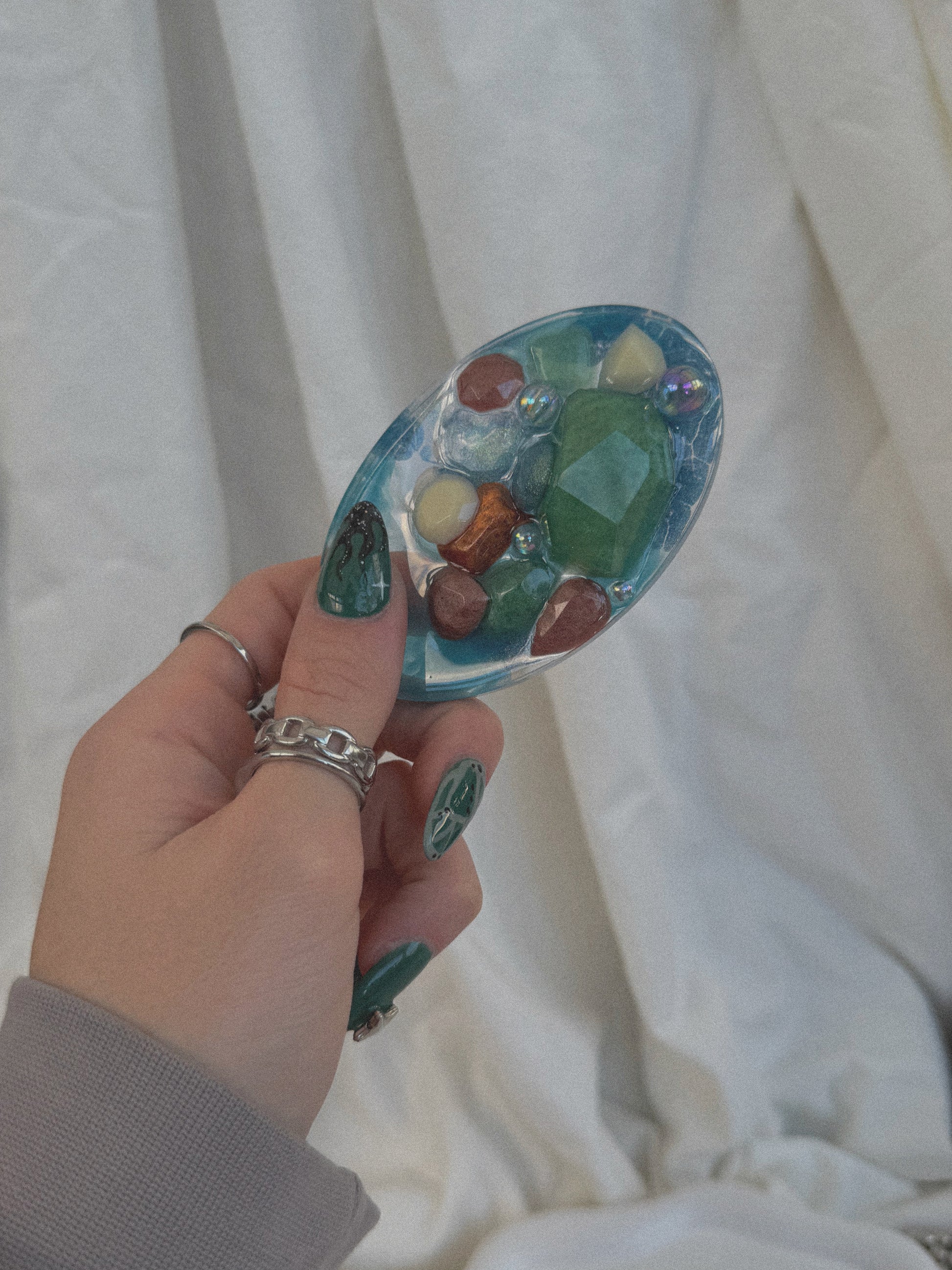 This oval is a shiny blue mixed with transparent thick base, with hand made faux gems on top in a mix of sizes and shapes in greens, blues and neutral colours.