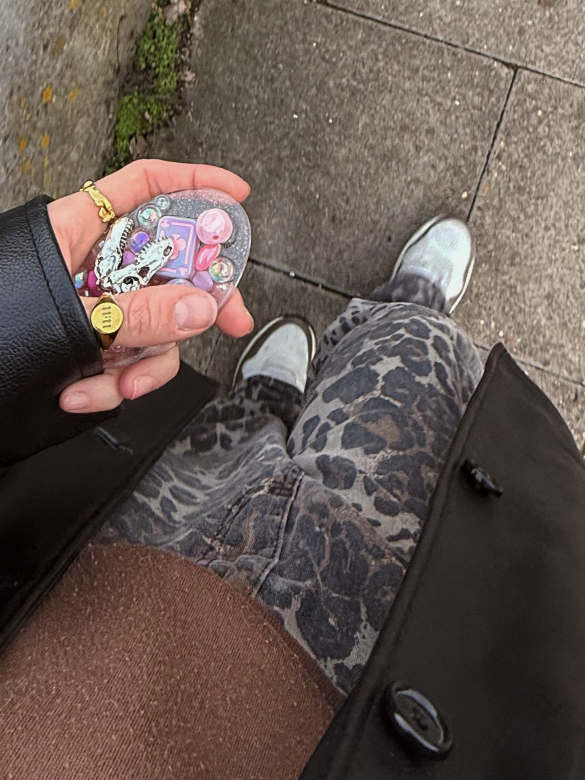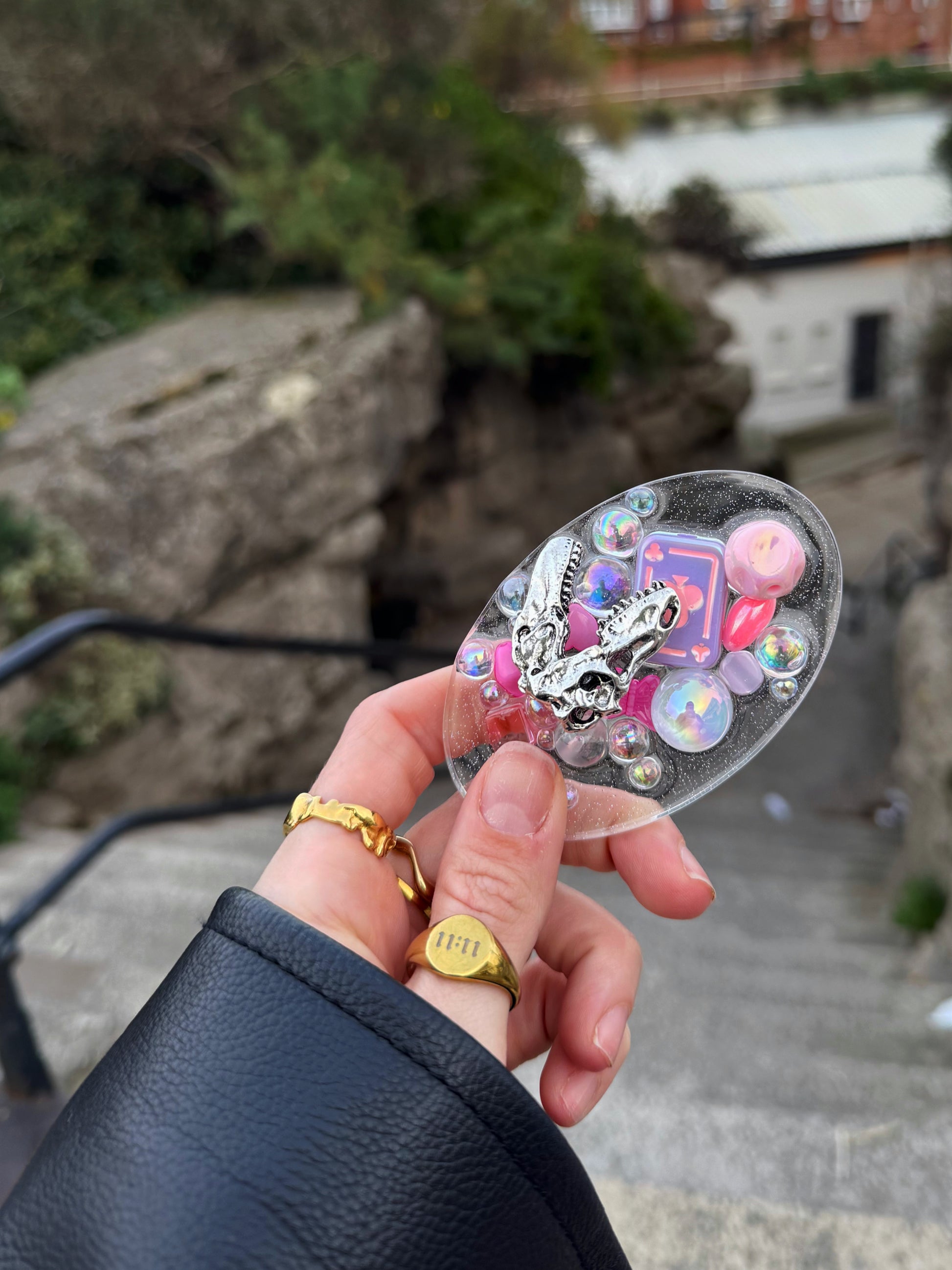 This oval is a holographic silver sparkle base with pink and lilac random pieces of treasure on top, the silver dinosaur skull sits inbetween the chunky pieces of texture.