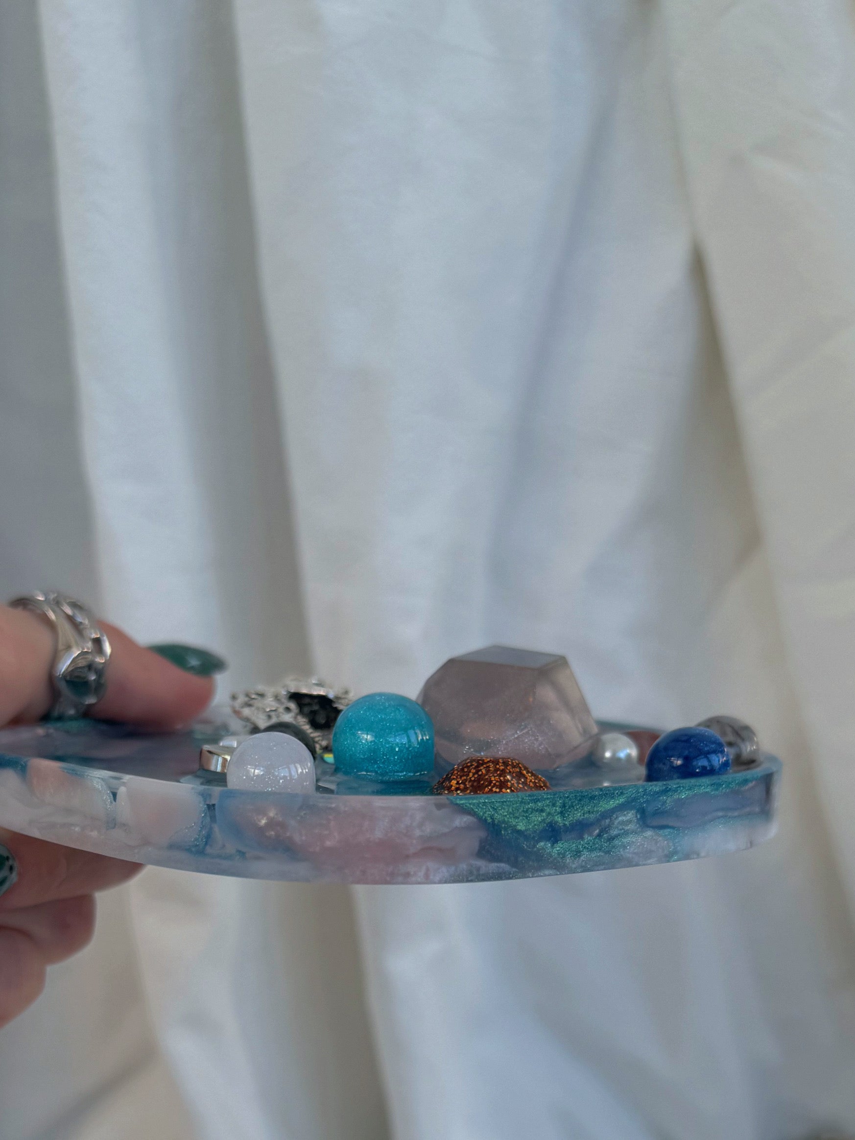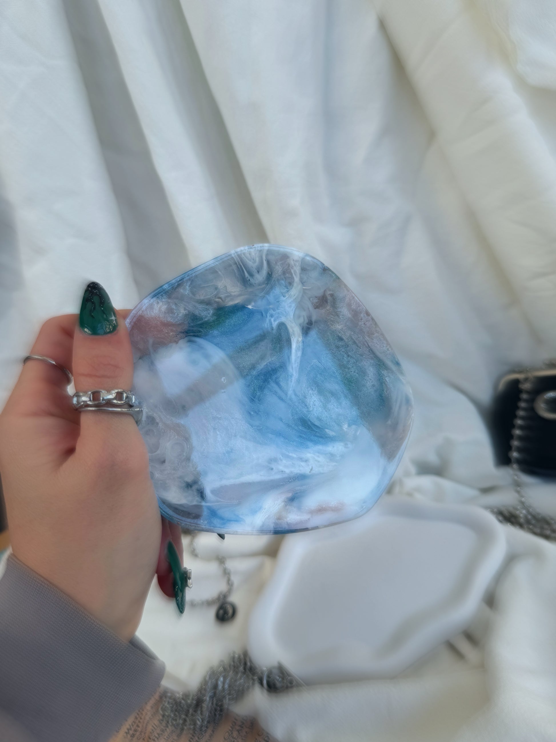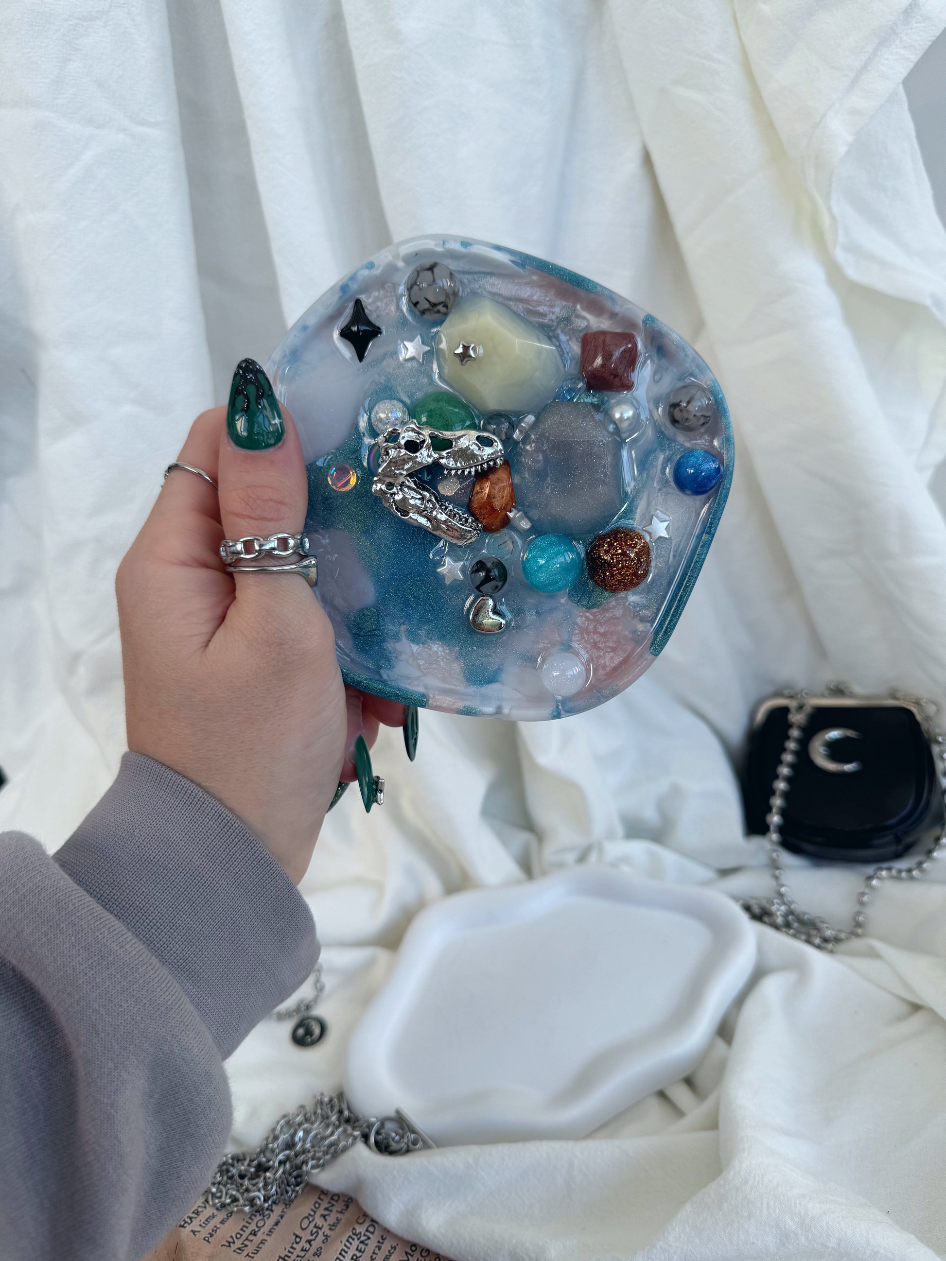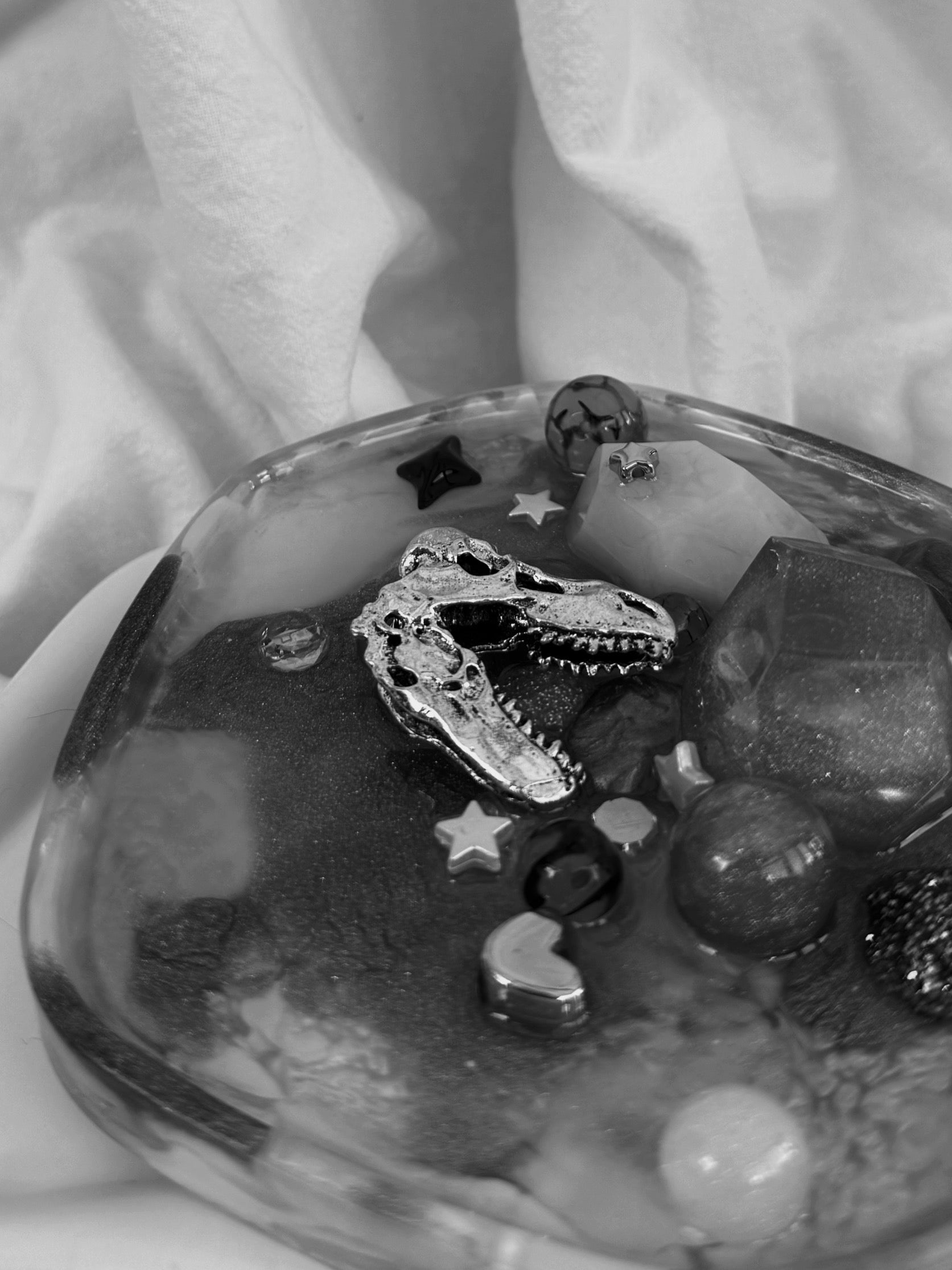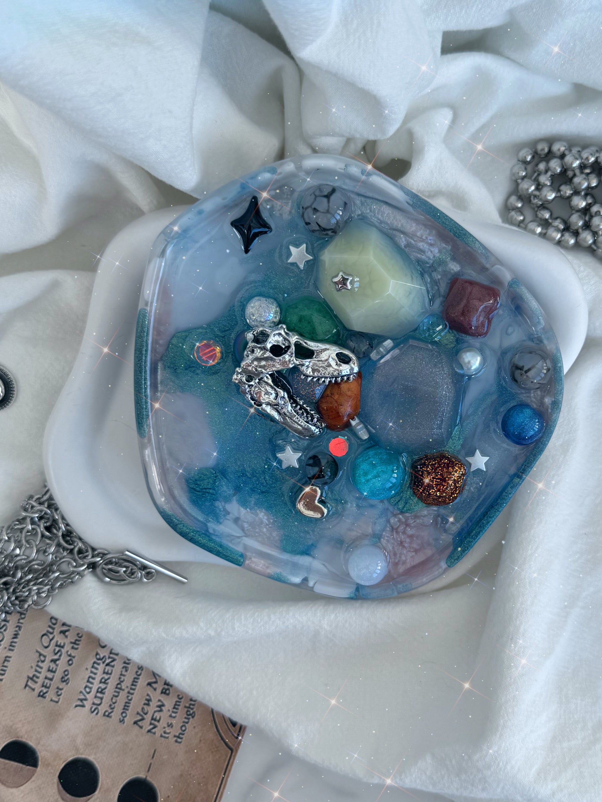 A base of blue, cream, clear and white, swirled together to create a marbled magical base. Ontop is a mix of hand made resin gems, a large silver metal dinosaur skull and small silver metal stars scattered throughout. There is some space on top that has been left smooth, meaning this pentagon can double up as a dish for small items like rings or coins as well as a textured fidget for your fingertips.