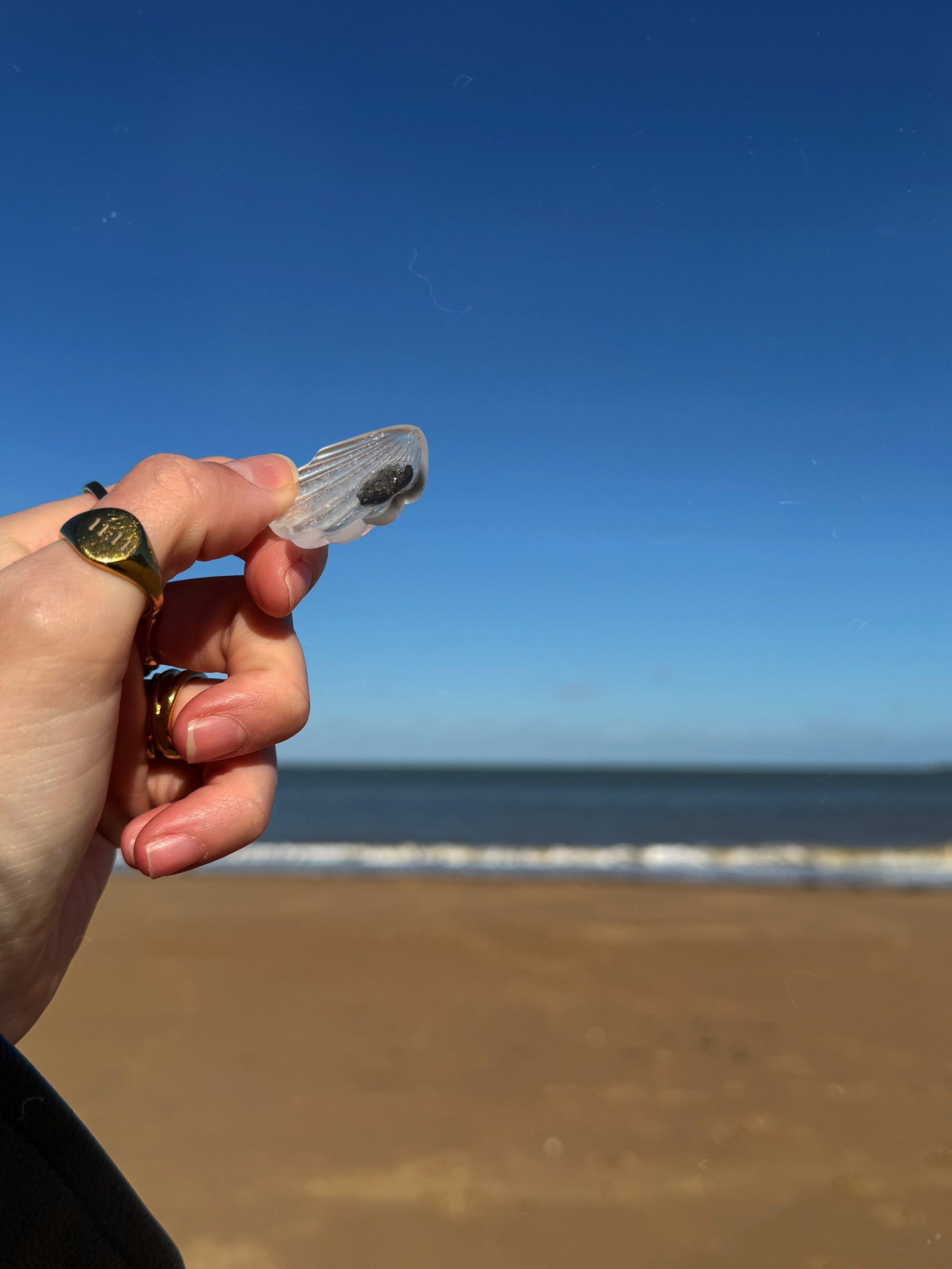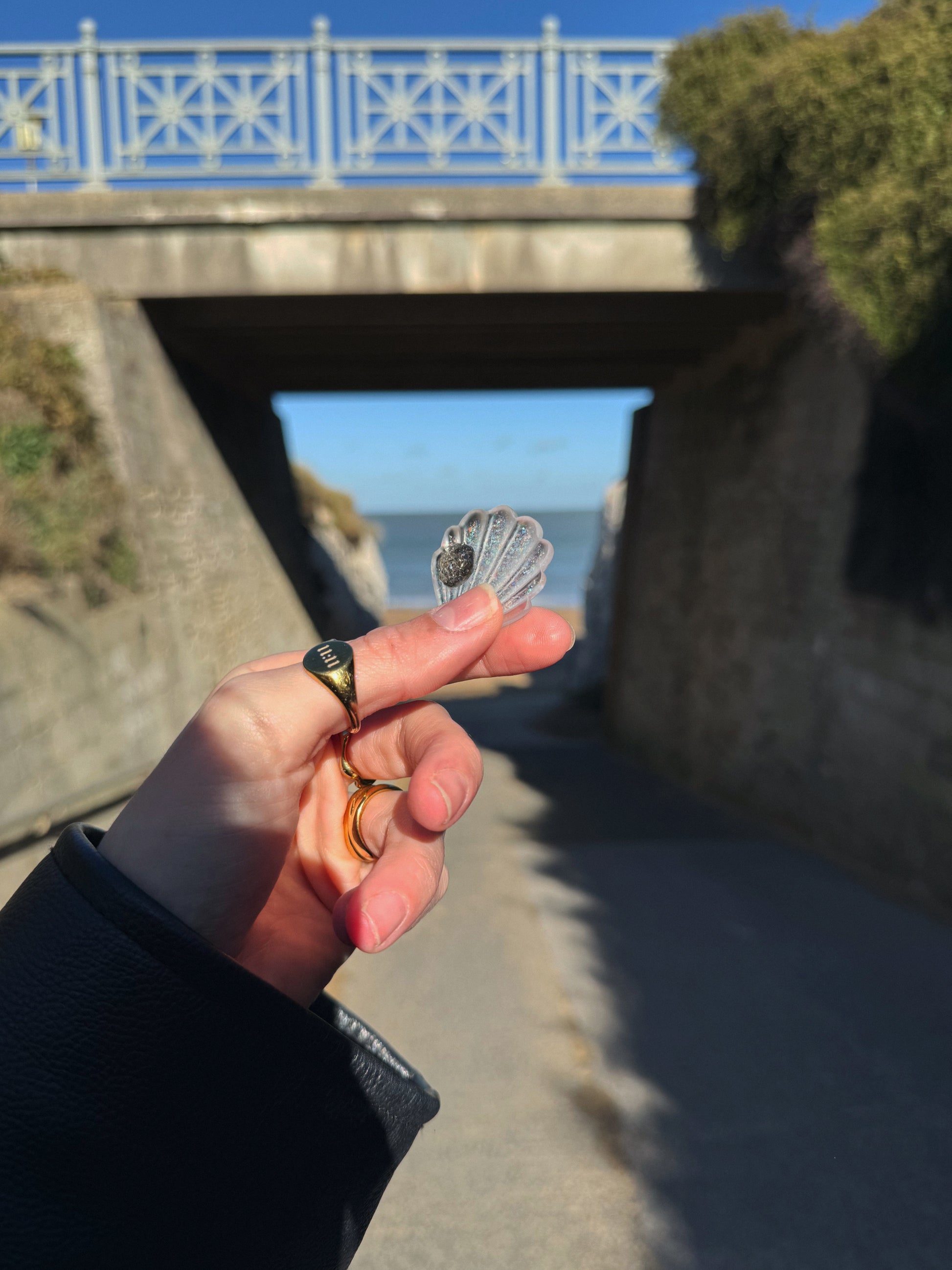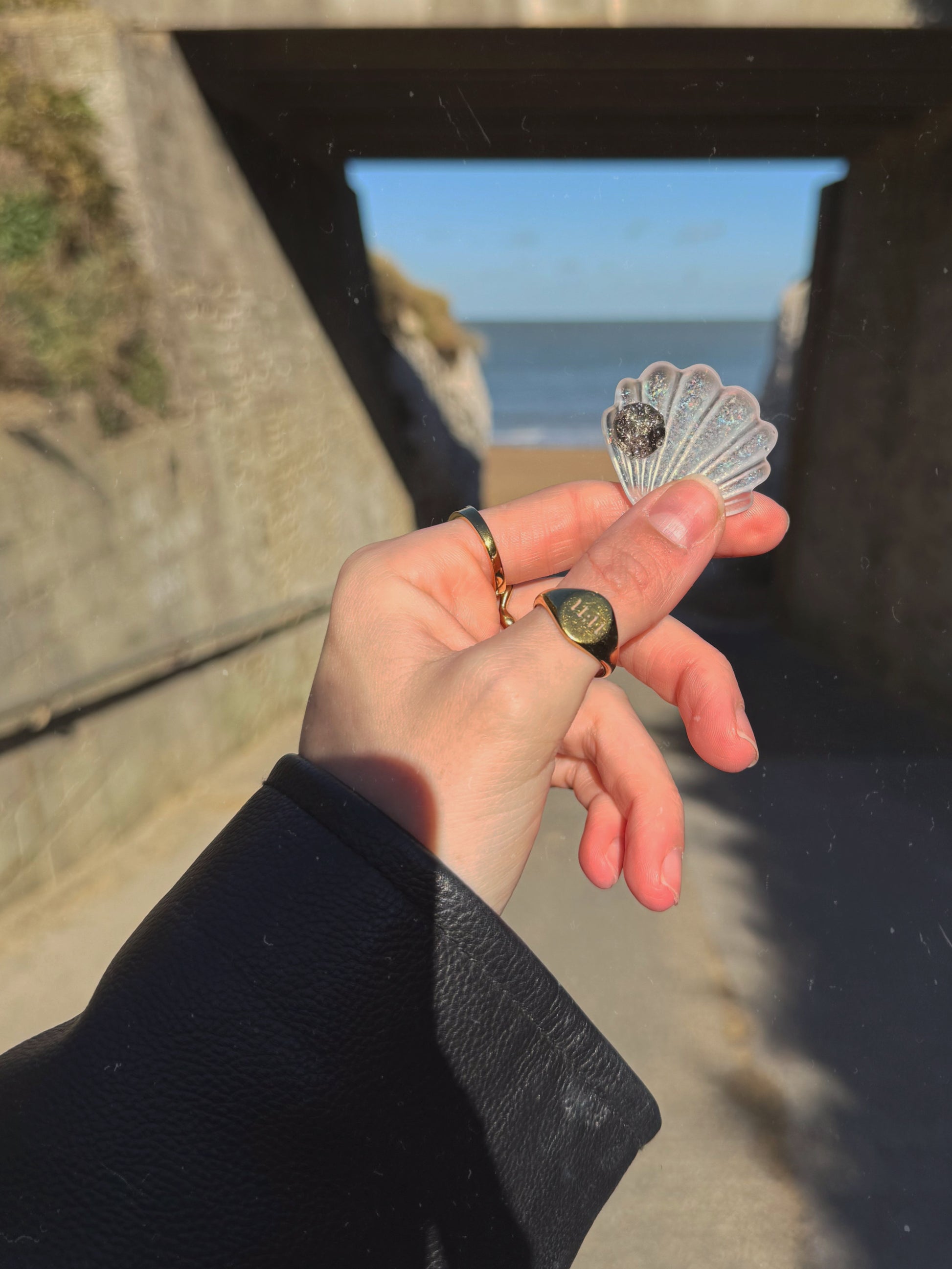 Our pocket shell is one of our tiniest Fidgets measuring in at just under 4 cm at the widest part, on the front, she has large ridges in the shape of a scallop shell, they provide a bumpy yet smooth texture, on the back this shell is a small circle patch of spikey scales.