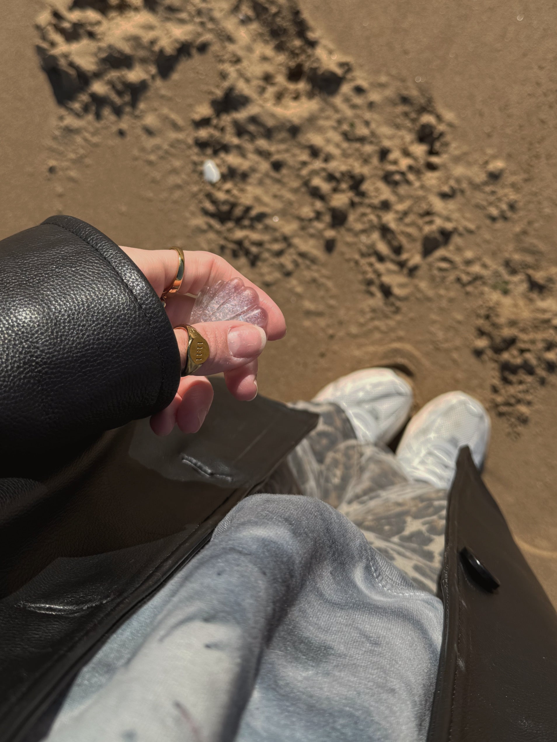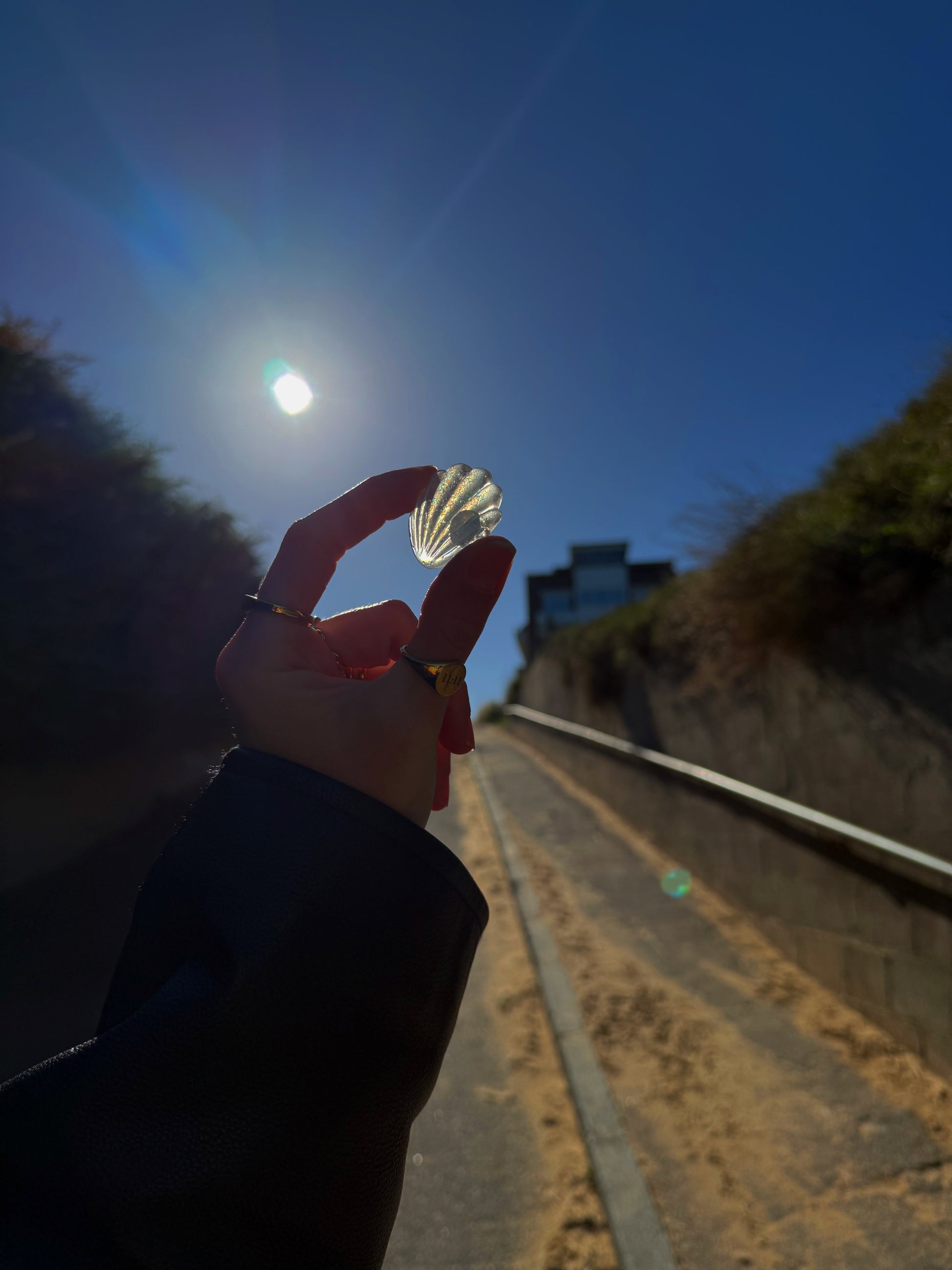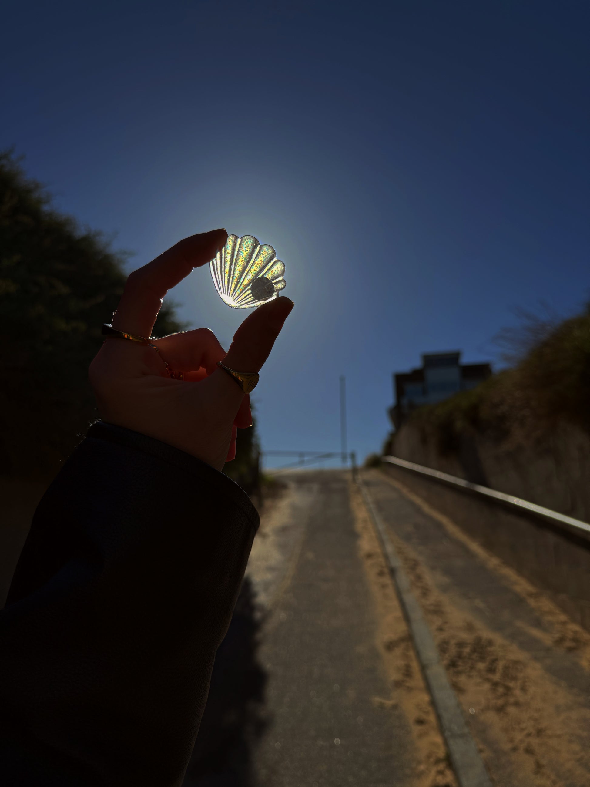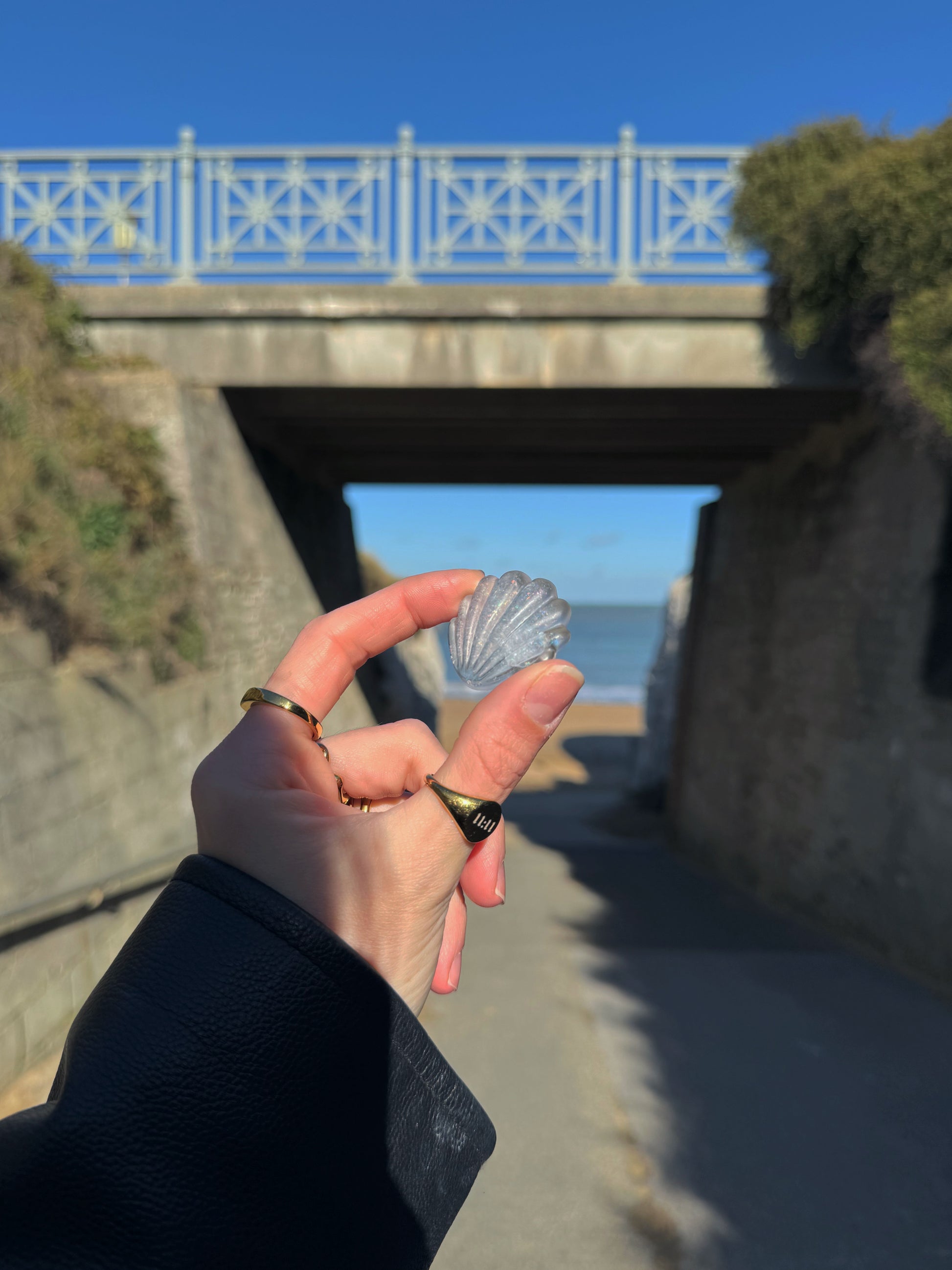 Our pocket shell is one of our tiniest Fidgets measuring in at just under 4 cm at the widest part, on the front, she has large ridges in the shape of a scallop shell, they provide a bumpy yet smooth texture, on the back this shell is a small circle patch of spikey scales.