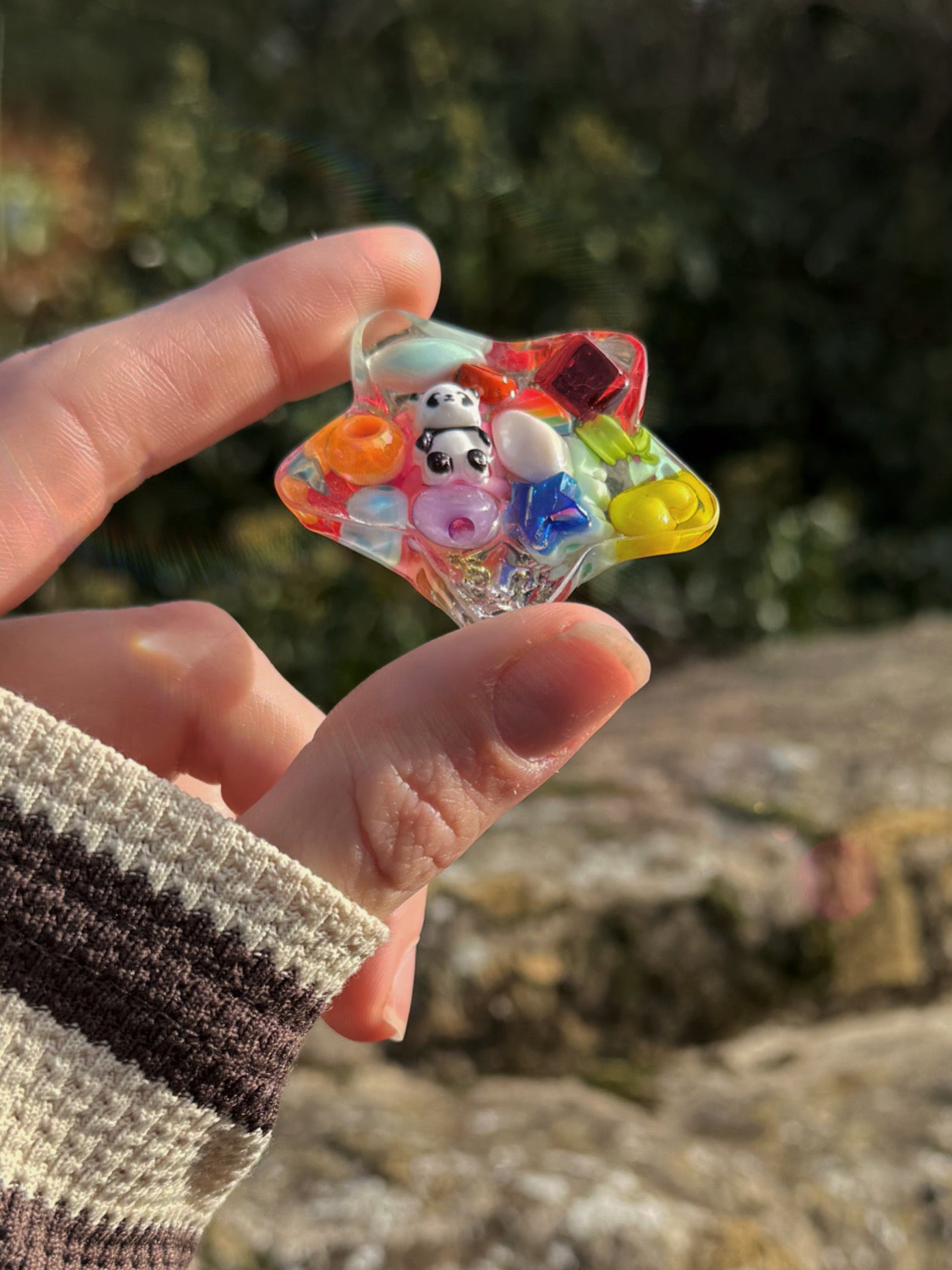 This transparent water star is full of random rainbow pieces inside with our classic jazshouse texture on the back. This batch has a panda on the outside edge.