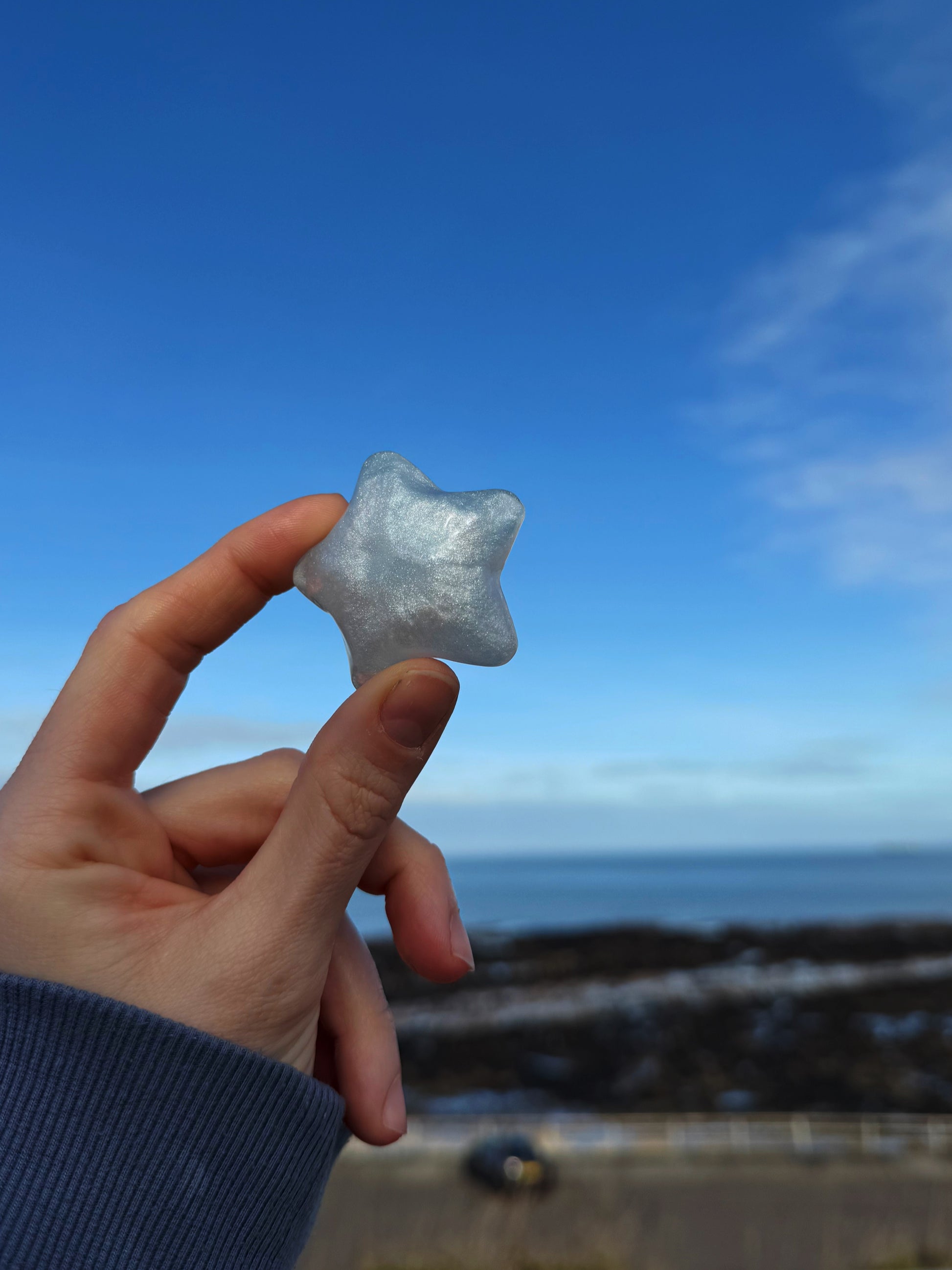This stunning water star is filled with a white chrome pigment making it almost shine blue in some lights, it has a super fine sparkle guide inside that you can see shimmering when you move the star, on the back are 3 of our jazshouse safe spikes. Designed to be gently pressed against skin for pain stimming.