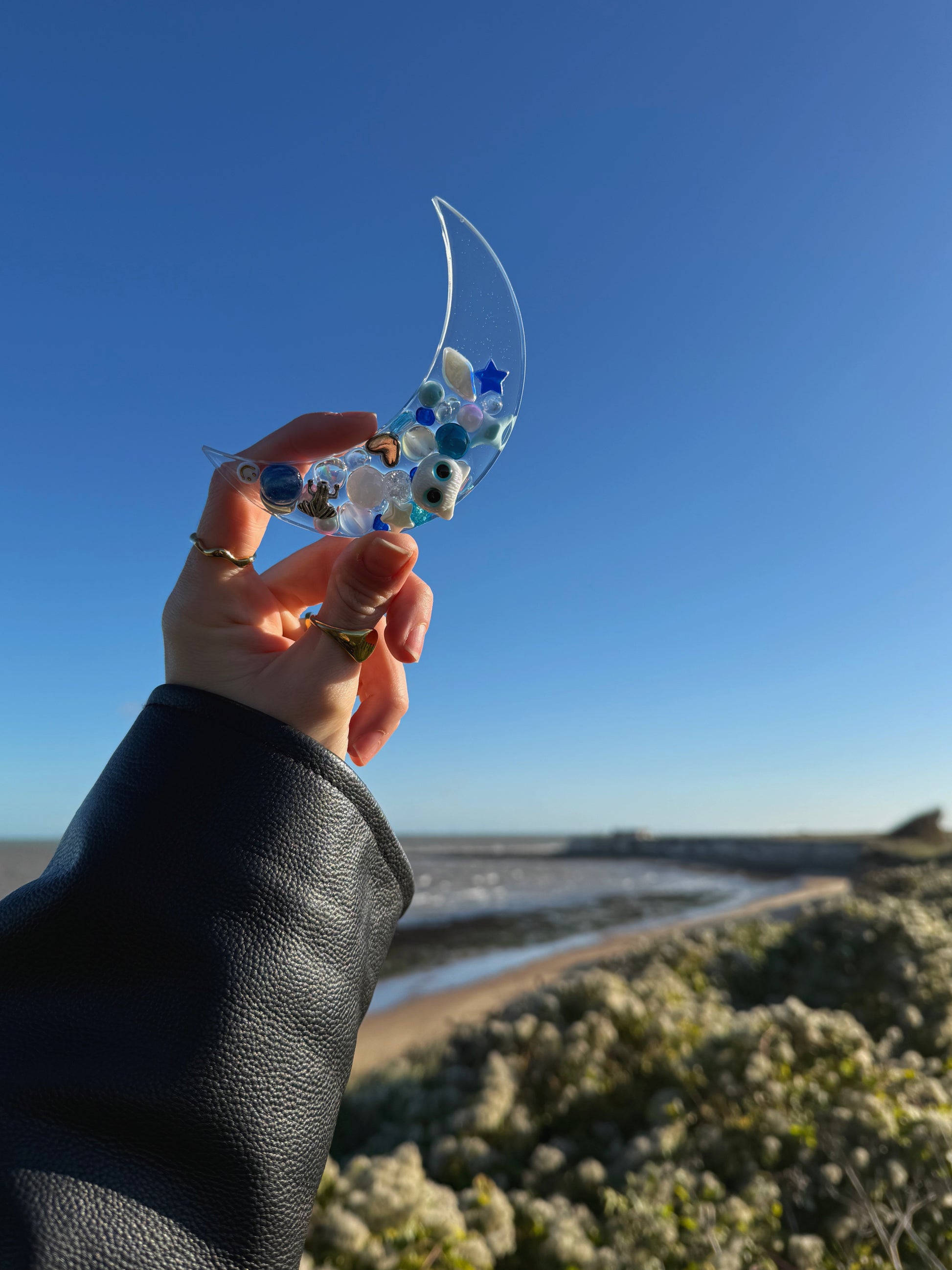 This mini Mildred moon a thick pink marbled crescent moon, with a single silver metal butterfly sword on top. Instead of having lots of texture on top this moon has just the bumps of the sword around lots of smooth resin.