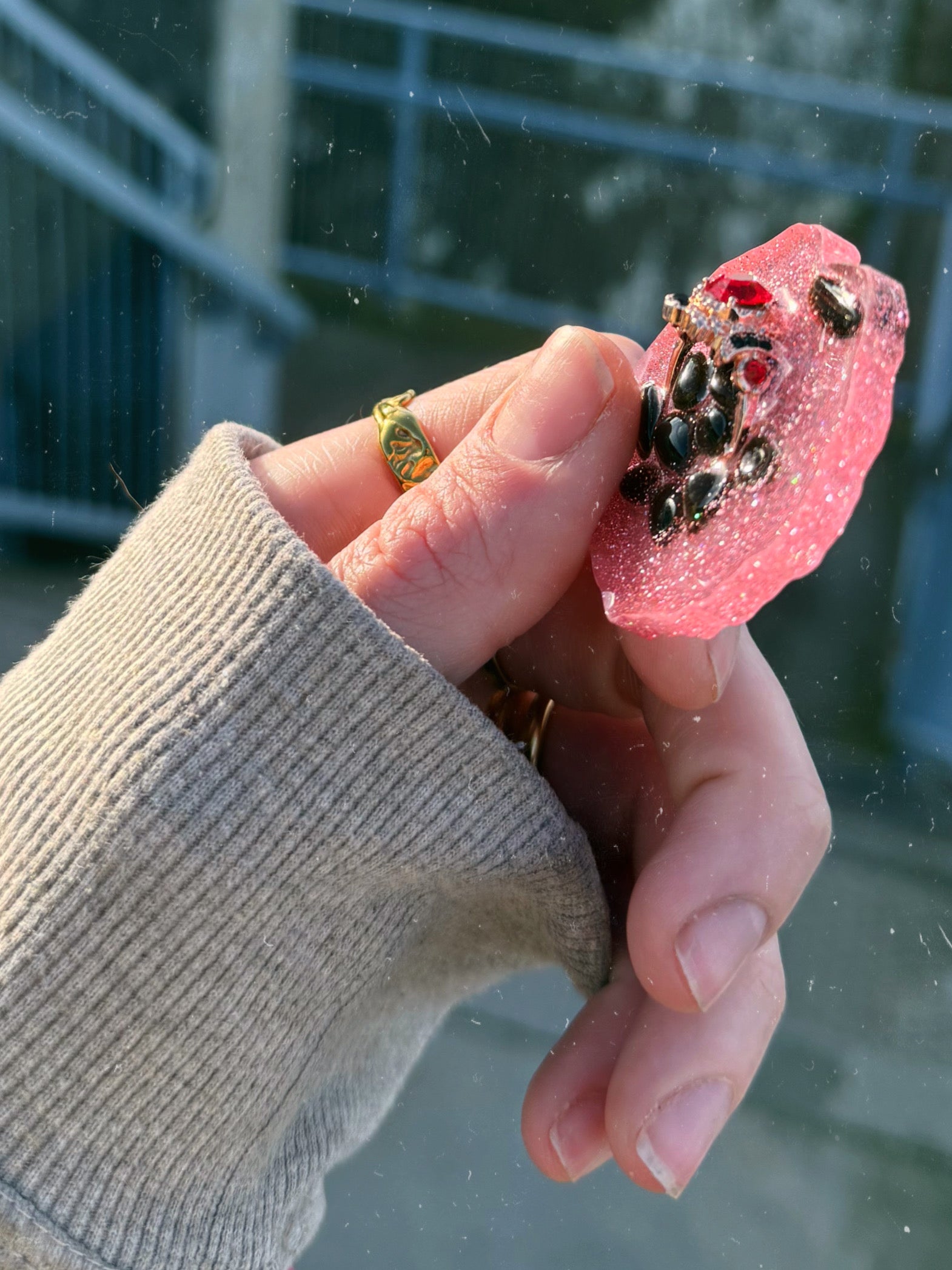 The geode orb has a perfectly bumpy edge all around the outside, this geode is a pink sparkle base, with a rose gold ring on top with a red gem at the centre, around the ring is black jasper gem stones, a protective mix of jewellery and gem stone, just like a dragon.
