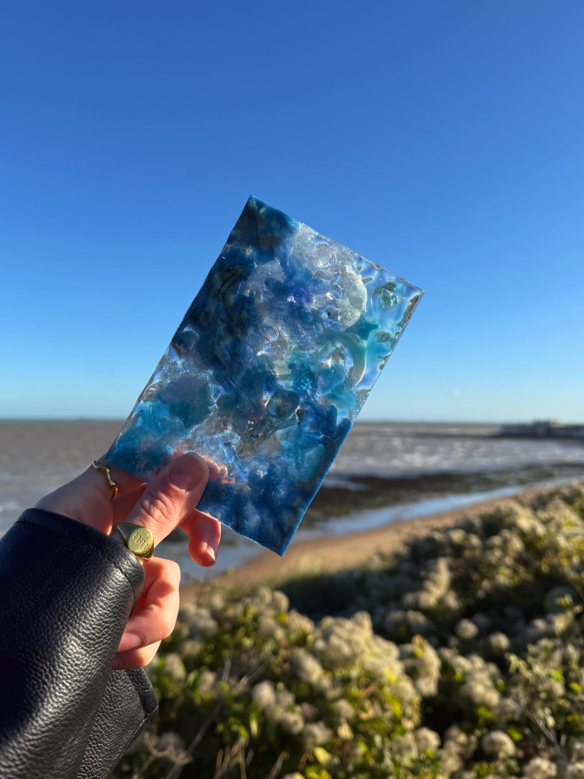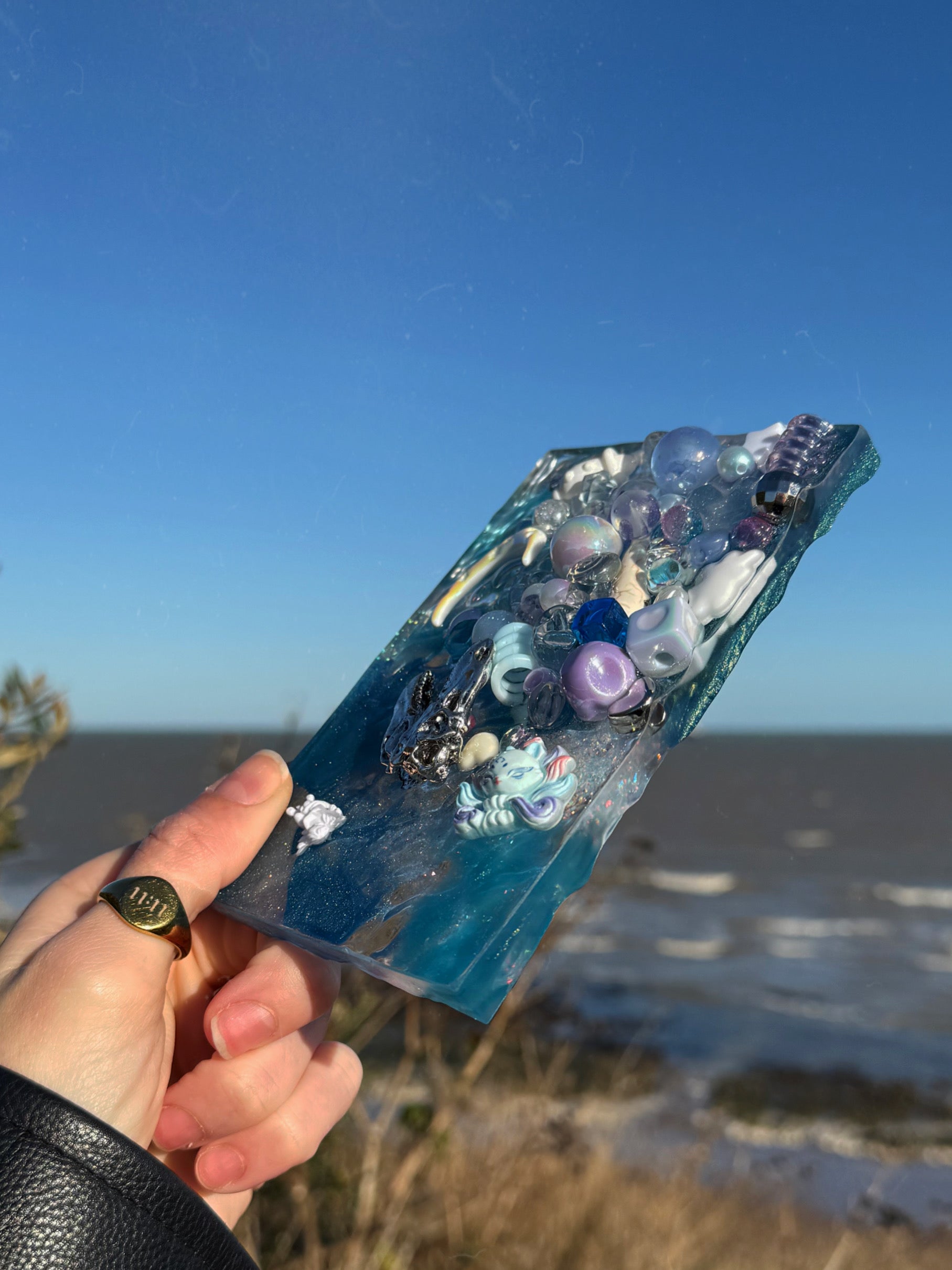 This tinker slab is a shiny green, blue, transparent blue and clear base, on top in a pile pattern it is full if huge chunky heavy pieces, Herod in the middle a silver dinosaur skull.