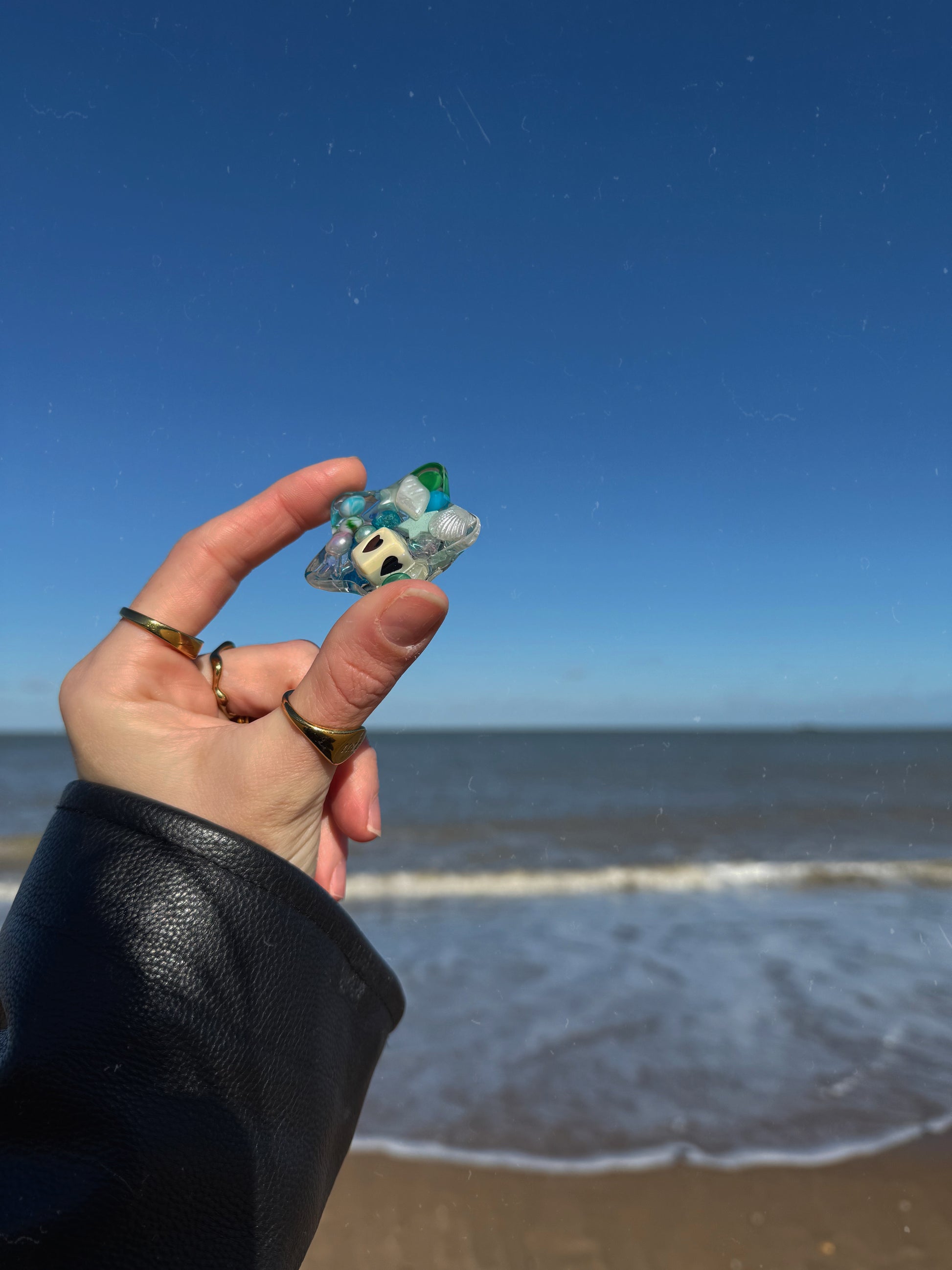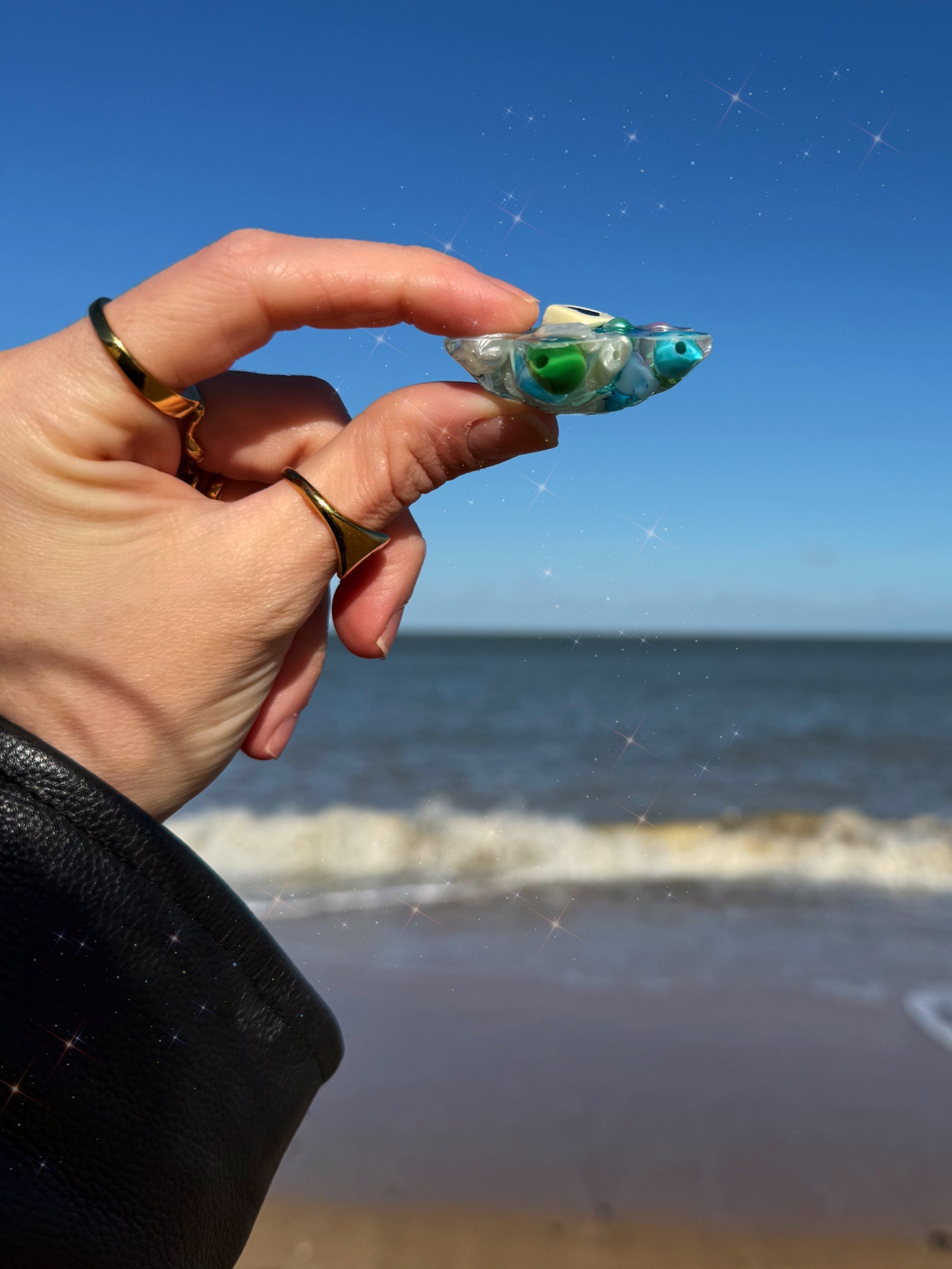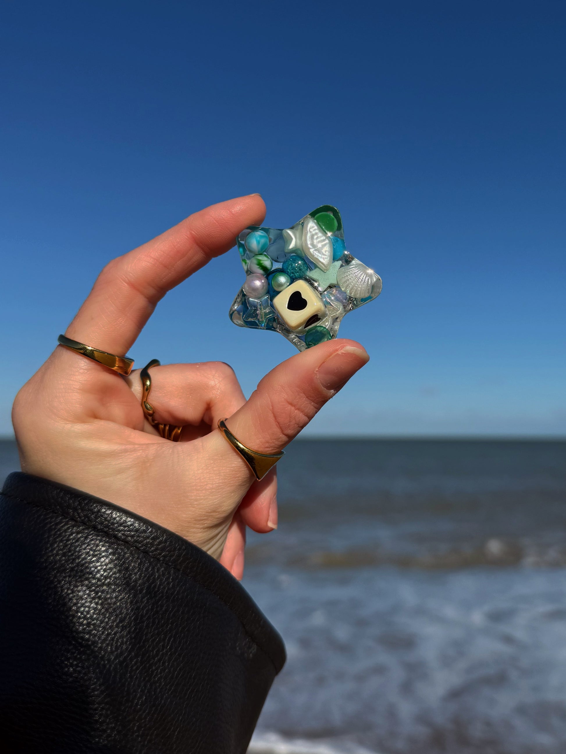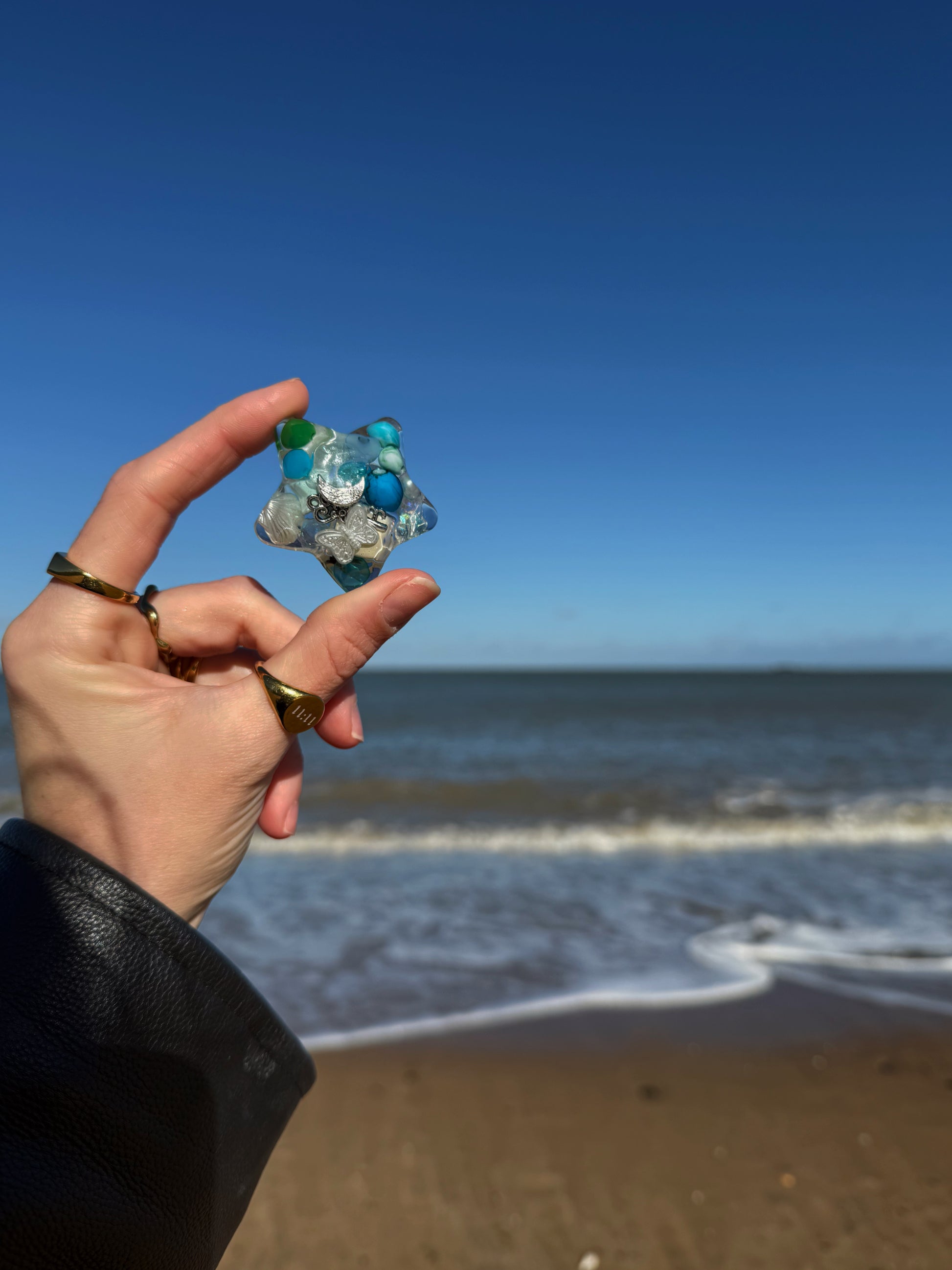 This Waterstar is a full palm sized pocket piece thick and chunky in the middle with a water bumpy smooth wave like texture on the bottom filled with blue and green themed treasure small pieces and a classic chunky textured jazshouse base.