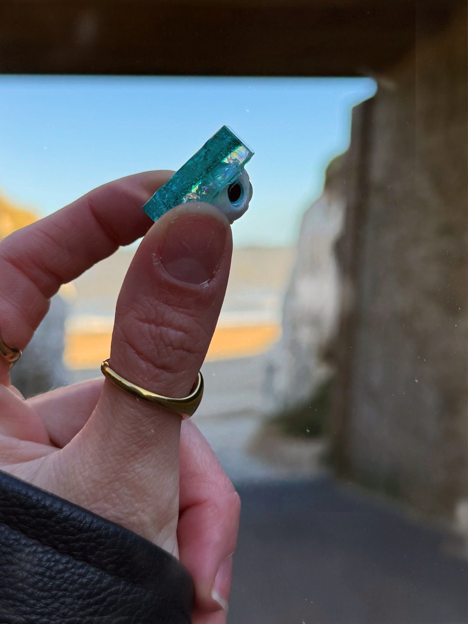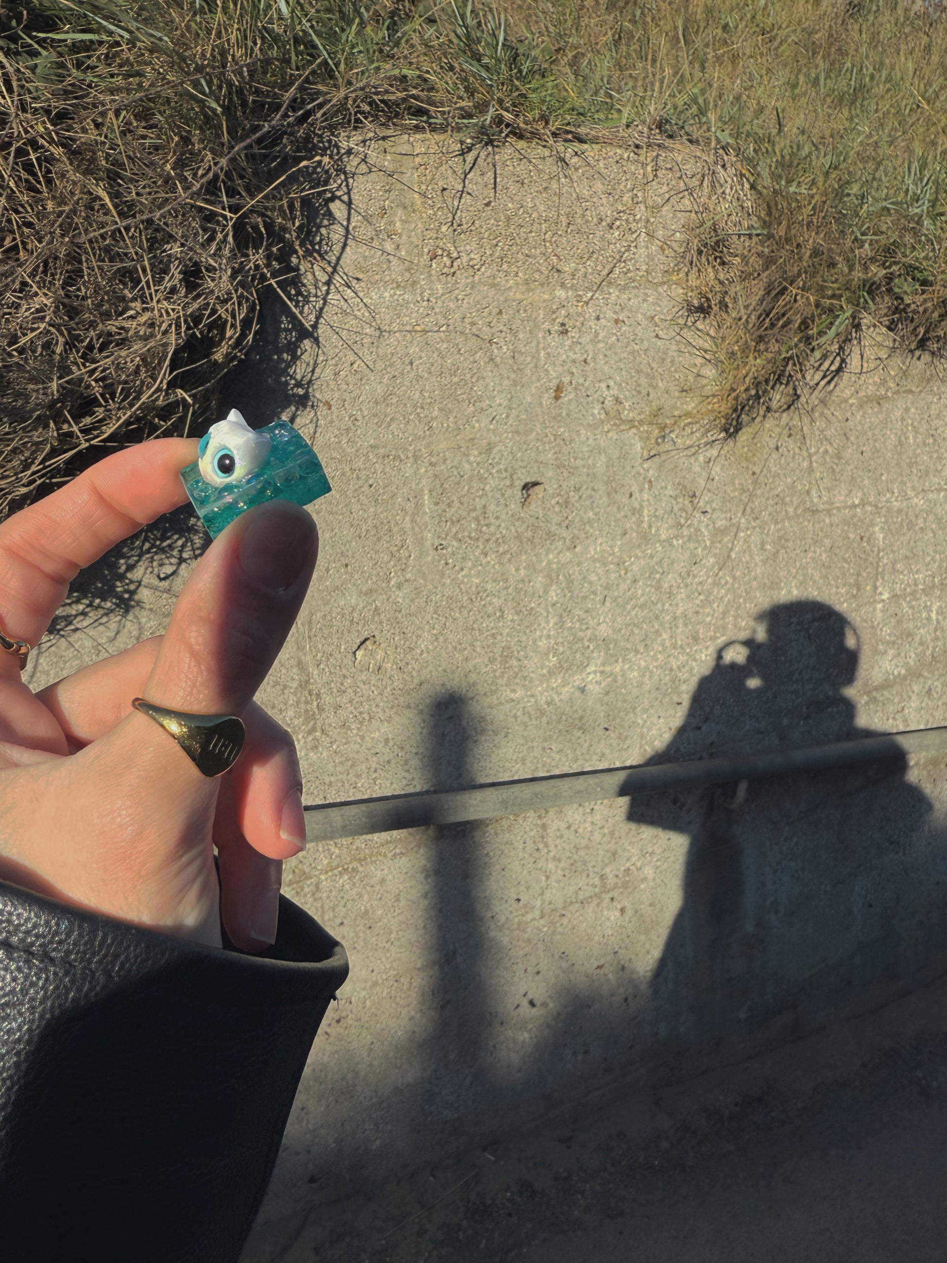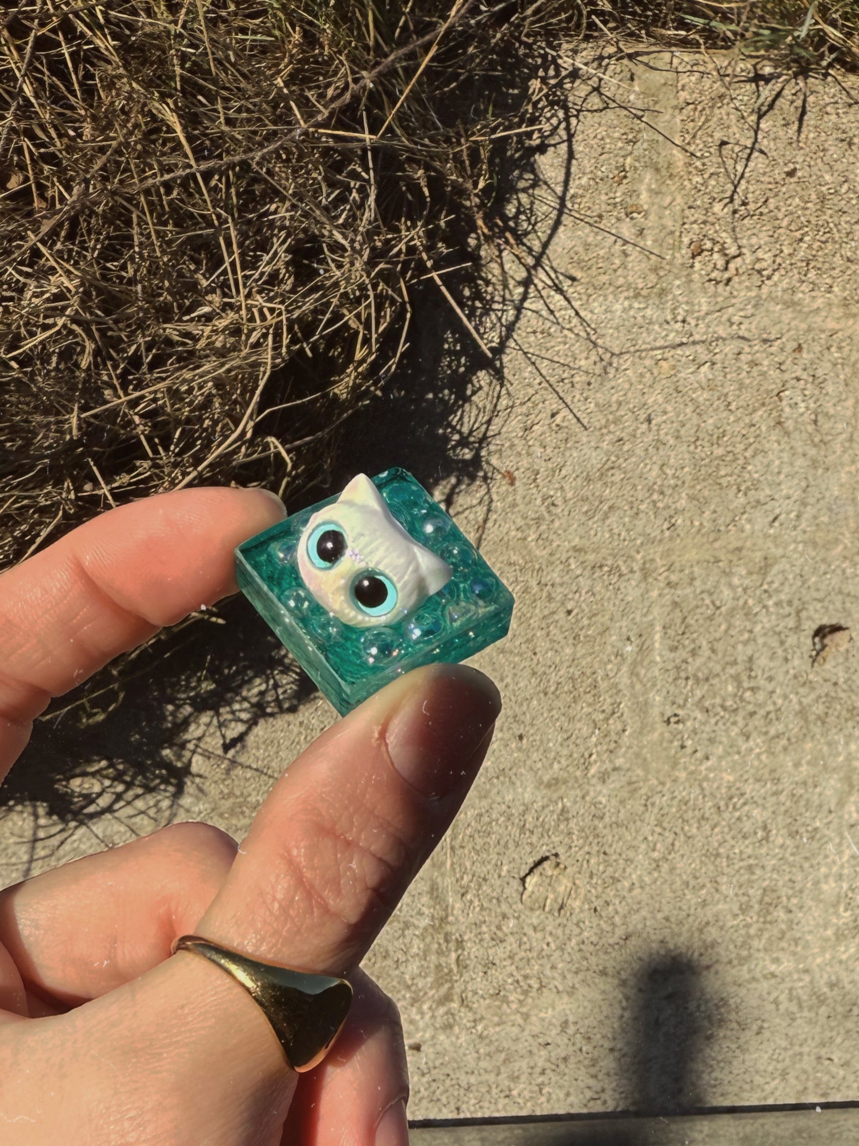 This pebble is a transparent sparkly teal base, on top and inside is full of mini iridescent sparkly acrylic bubbles with a white cat head sat on top. There are two places of texture on this fidget the perfectly concentric circles underneath and a smooth bumpy textured surface on top.