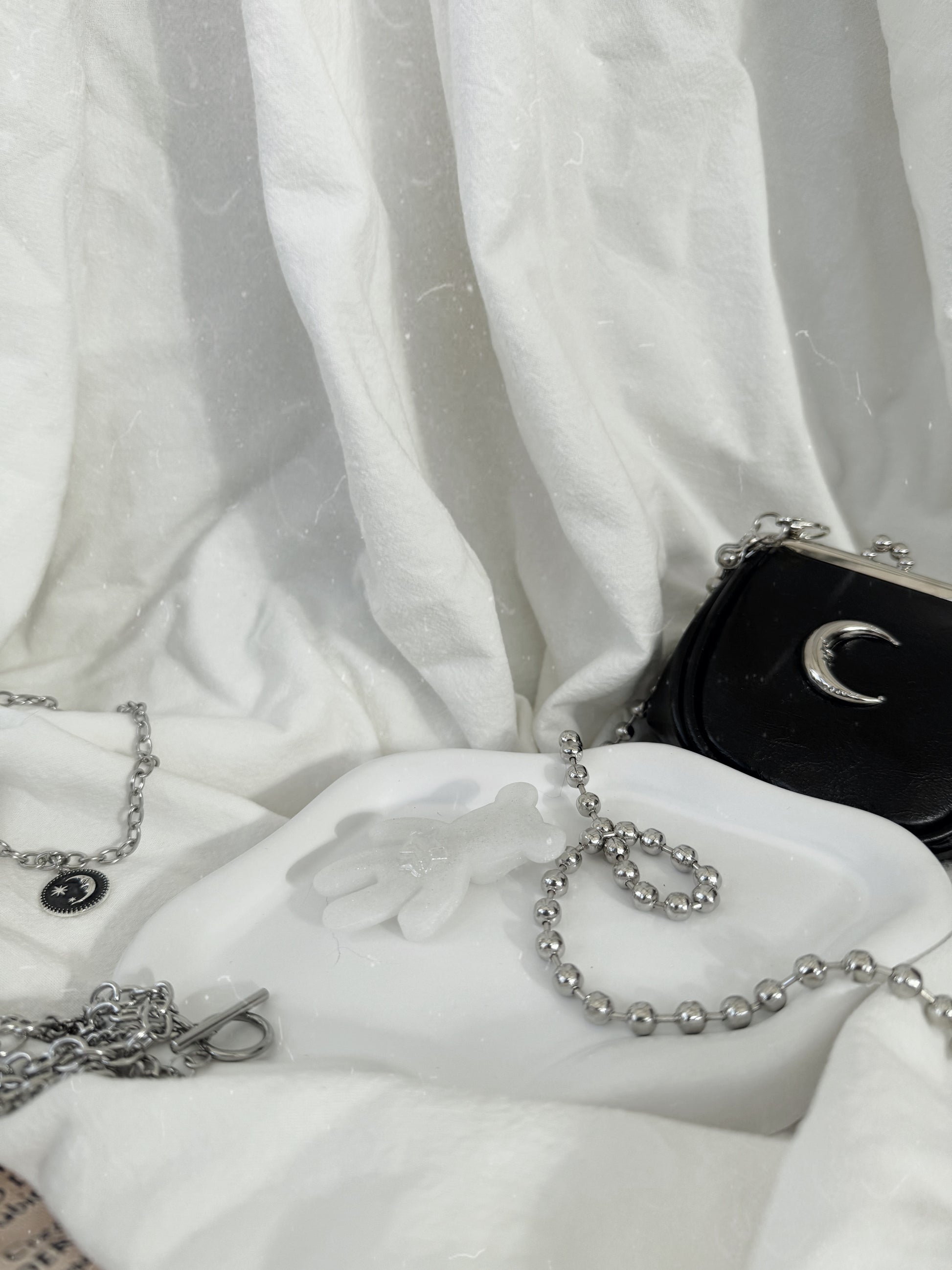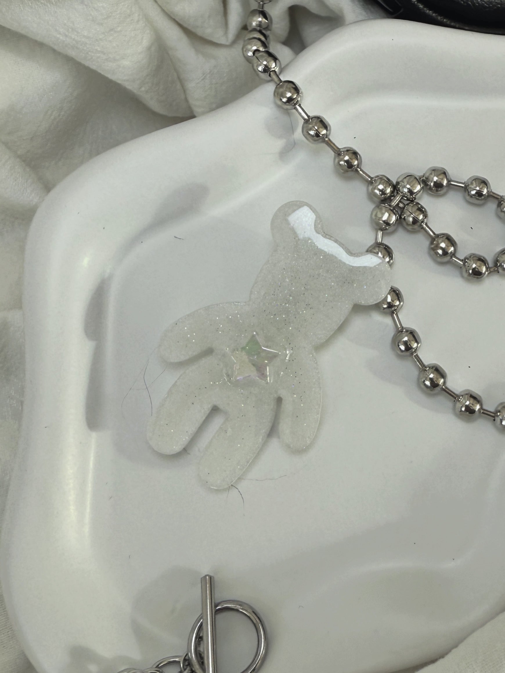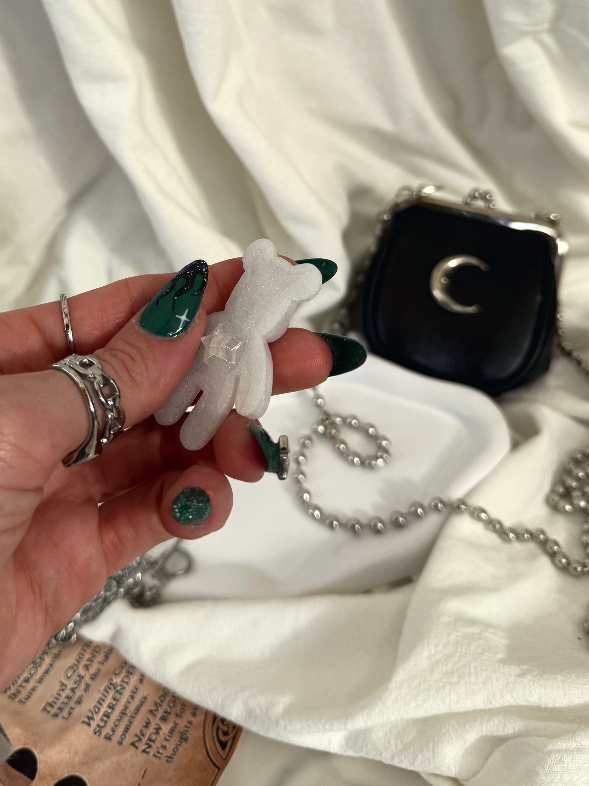 This worry bear is a creamy white shiny base, on the back is an iridescent star giving you the perfect piece of texture under your thumb.