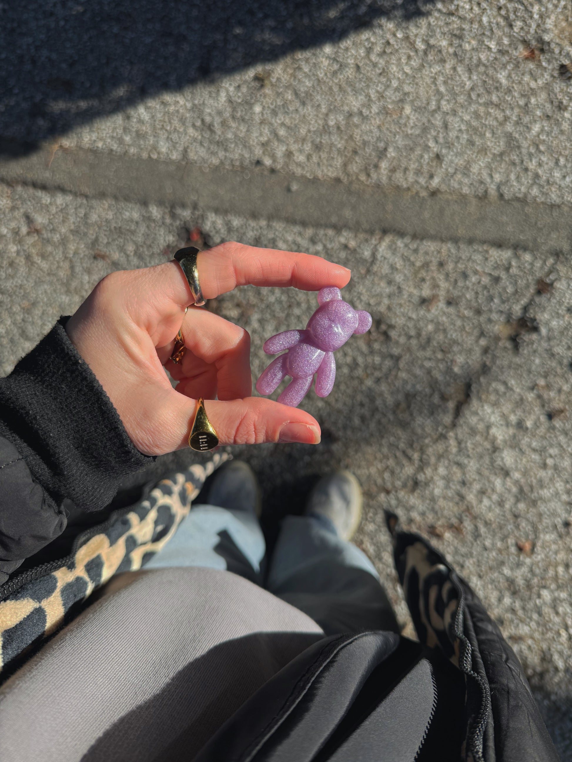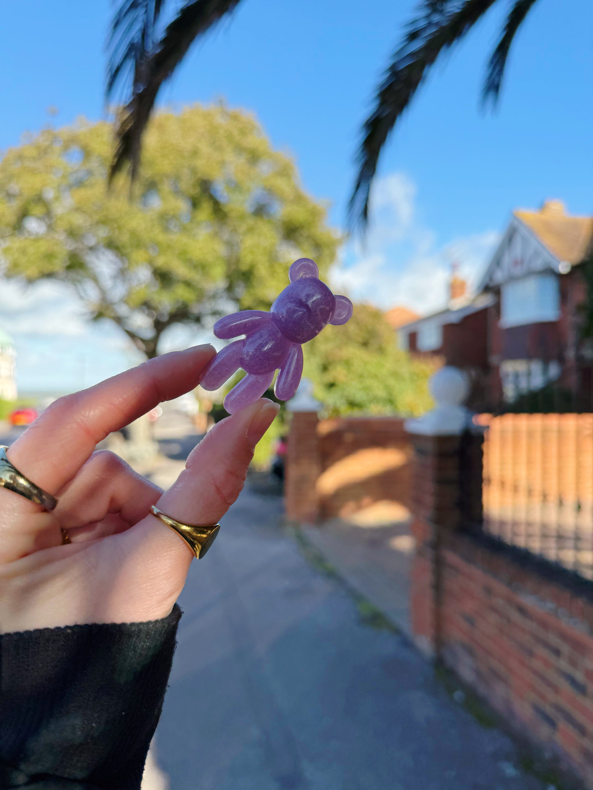 This worry bear is a bright purple shiny base, on the back is a iridescent bubble, the bubble is rounded and low and stands off the base of the bear in his ear, giving you the perfect little bump of texture under your thumb.